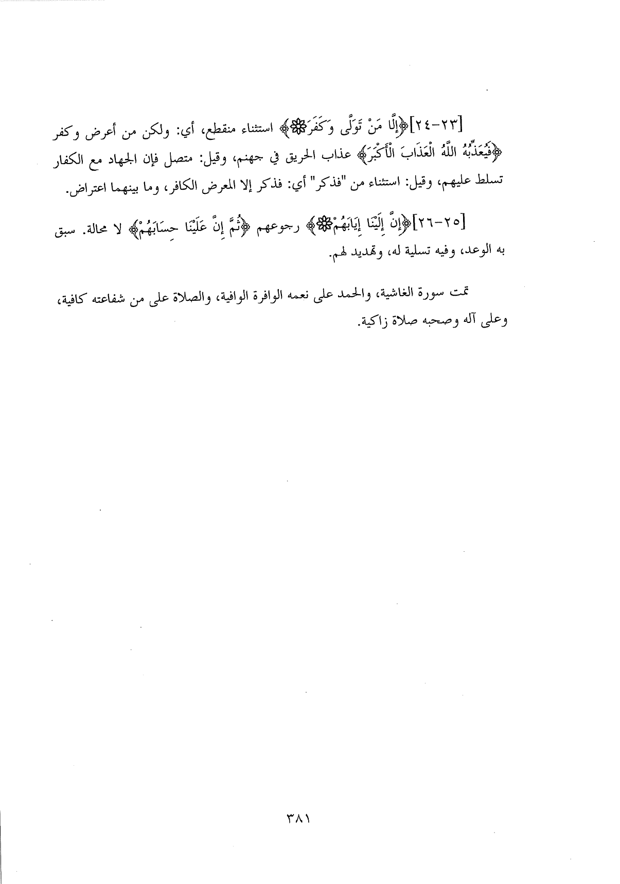 تمت سورة الغاشية، والحمد على نعمه الوافرة الوافية، والصلاة على من شفاعته كافية، وعلى آله وصحبه صلاة زاكية.