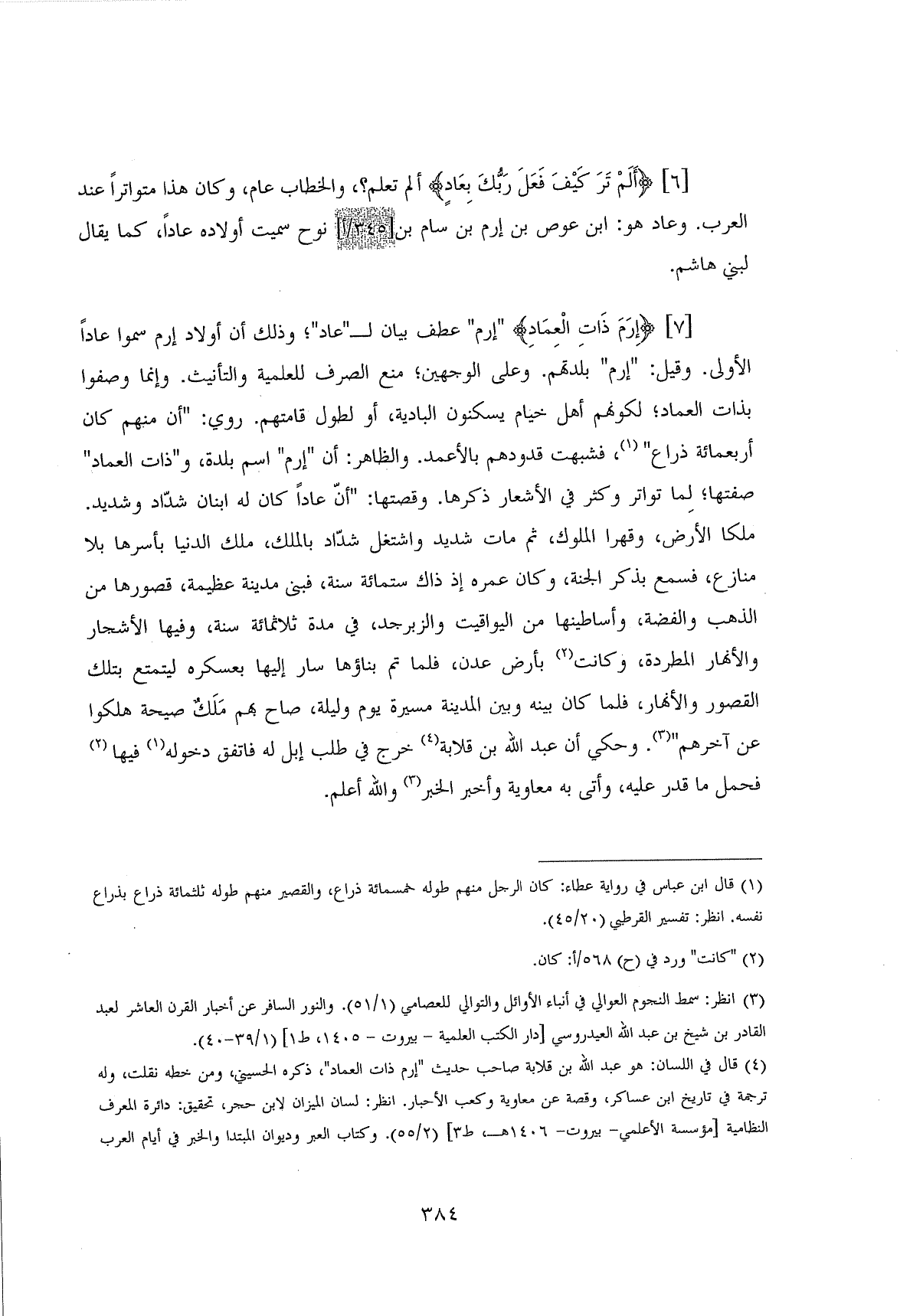 (أَلَمْ تَرَ كَيْفَ فَعَلَ رَبُّكَ بِعَادٍ (6) ألم تعلم؟، والخطاب عام، وكان هذا متواترًا عند العرب. وعاد هو: ابن عوص بن إرم بن سام بن نوح سميت أولاده عاداً، كما يقال لبني هاشم.