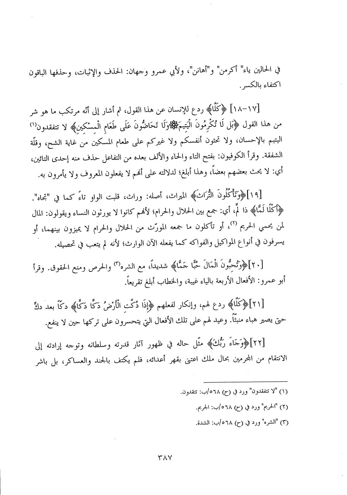 (كَلَّا ... (17) ردع للإنسان عن هذا القول، ثم أشار إلى أنه مرتكب ما هو شر من هذا القول (بَلْ لَا تُكْرِمُونَ الْيَتِيمَ * وَلَا تَحَاضُّونَ عَلَى طَعَامِ الْمِسْكِينِ (18) لا تتفقدون اليتيم بالإحسان، ولا تحثون أنفسكم ولا غيركم على طعام المسكين من غاية الشح، وقلّة الشفقة. وقرأ الكوفيون: بفتح التاء والحاء والألف بعده من التفاعل حذف منه إحدى التائين، أي: لا يحث بعضهم بعضاً، وهذا أبلغ؛ لدلالته على أنهم لا يفعلون المعروف ولا يأمرون به.