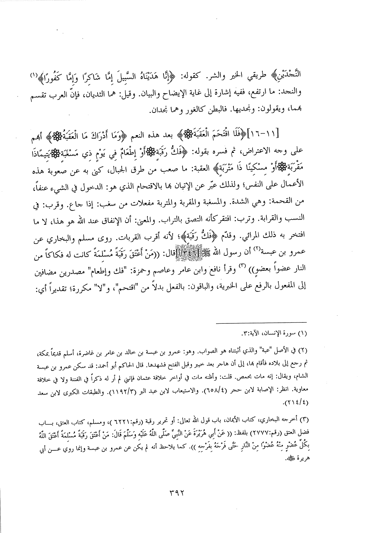 (فَلَا اقْتَحَمَ الْعَقَبَةَ (11) بعد هذه النعم (وَمَا أَدْرَاكَ مَا الْعَقَبَةُ (12) أبهم على وجه الاعتراض، ثم فسره بقوله: (فَكُّ رَقَبَةٍ (13) أَوْ إِطْعَامٌ فِي يَوْمٍ ذِي مَسْغَبَةٍ (14) يَتِيمًا ذَا مَقْرَبَةٍ (15) أَوْ مِسْكِينًا ذَا مَتْرَبَةٍ (16) العقبة: ما صعب من طرق الجبال، كنى به عن صعوبة هذه الأعمال على النفس؛ ولذلك عبّر عن الإتيان هما بالاقتحام الذي هو: الدخول في الشيء عنفاً، من القحمة: وهى الشدة. والمسغبة والمقربة والمتربة مفعلات من سغب: إذا جاع. وقرب: في النسب والقرابة. وترب: افتقر كأنه التصق بالتراب. والمعنى: أن الإنفاق عند اللَّه هو هذا، لا ما افتخر به ذلك المرائي. وقدّم (فَكُّ رَقَبَةٍ)؛ لأنه أقرب القربات. روى مسلم والبخاري عن عمرو بن عبسة أن رسول اللَّه - صلى الله عليه وسلم - قال: " مَنْ أَعْتَقَ رَقبَةً مُسلِمَةً كانت له فكاكاً من النار عضواً بعضوٍ " وقرأ نافع وابن عامر وعاصم وحمزة: " فك وإطعام " مصدرين مضافين إلى المفعول بالرفع على الخبرية، والباقون: بالفعل بدلًا من " اقتحم "، و " لا " مكررة؛ تقديراً أي: