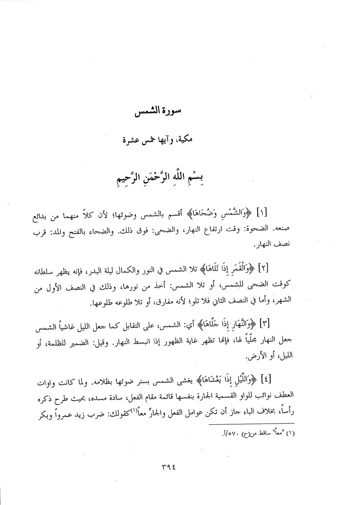 وَالشَمْسِ وَضُحَاهَا (1) أقسم بالشمس وضوئها؛ لأن كلًّا منهما من بدائع صنعه. الضحوة: وقت ارتفاع النهار، والضحى: فوق ذلك. والضحاء بالفتح والمد: قرب نصف النهار.