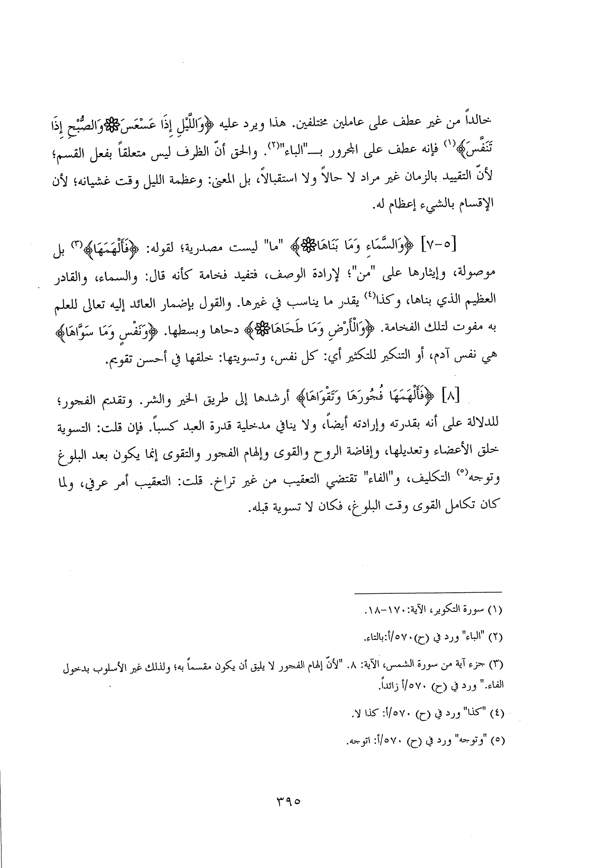 (وَالسَّمَاءِ وَمَا بَنَاهَا (5) " ما " ليست مصدرية؛ لقوله: (فَأَلْهَمَهَا) بل موصولة، وإيثارها على " من "؛ لإرادة الوصف، فتفيد فخامة كأنه قال: والسماء، والقادر العظيم الذي بناها، وكذا يقدر ما يناسب في غيرها. والقول بإضمار العائد إليه تعالى للعلم به مفوت لتلك الفخامة. (وَالْأَرْضِ وَمَا طَحَاهَا (6) دحاها وبسطها. (وَنَفْسٍ وَمَا سَوَّاهَا (7) هي نفس آدم، أو التنكير للتكثير أي: كل نفس، وتسويتها: خلقها في أحسن تقويم.