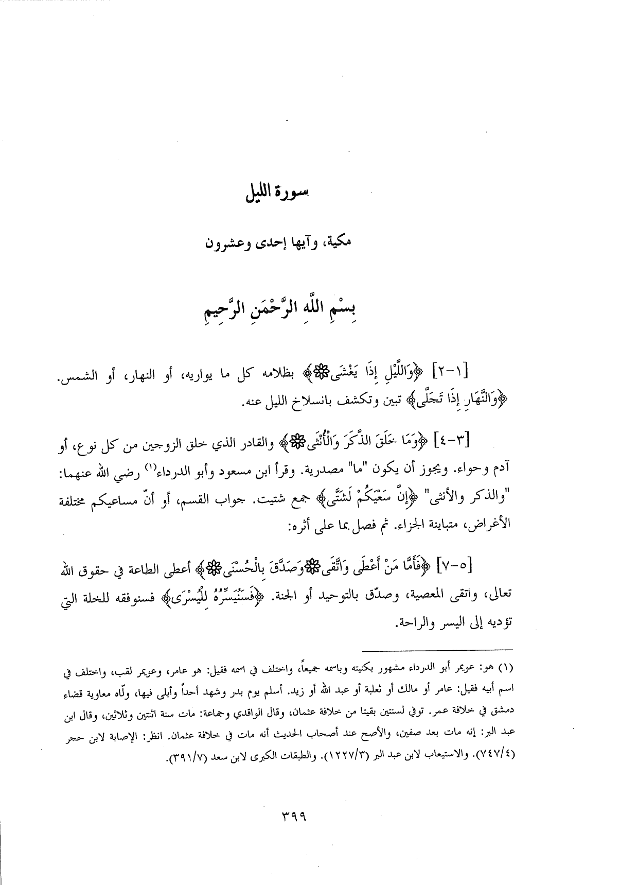 (وَمَا خَلَقَ الذَّكَرَ وَالْأُنْثَى (3) والقادر الذي خلق الزوجين من كل نوع، أو آدم وحواء. ويجوز أن يكون " ما " مصدرية. وقرأ ابن مسعود وأبو الدرداء رضي اللَّه عنهما: " والذكر والأنثى ". (إِنَّ سَعْيَكُمْ لَشَتَّى (4) جمع شتيت. جواب القسم، أو أنَّ مساعيكم مختلفة الأغراض، متبايتة الجزاء. ثم فضل بما على أثره: