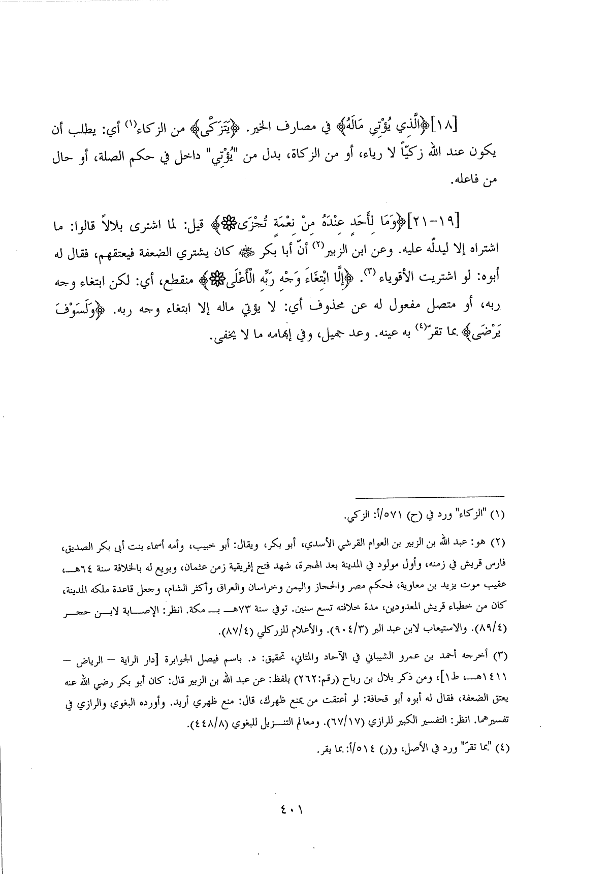 (الَّذِي يُؤْتِي مَالَهُ ... (18) في مصارف الخير. (يَتَزَكَّى) من الزكاء أي: يطلب أن يكون عند اللَّه زكيًّا لا رياء، أو من الزكاة، بدل من " يُؤْتِي " داخل في حكم الصلة، أو حال من فاعله.