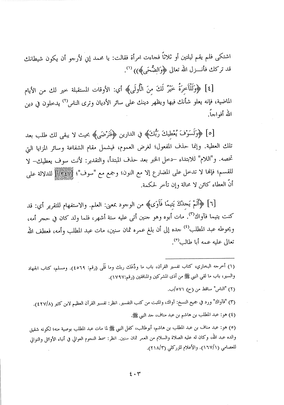 (أَلَمْ يَجِدْكَ يَتِيمًا فَآوَى (6) من الوجود بمعنى: العلم. والاستفهام للتقرير أي: قد كنت يتيما فآواك، مات أبوه وهو جنين أتى عليه ستة أشهر، فلما ولد كان في حجر أمه، ويحوطه عبد المطلب جده إلى أن بلغ عمره ثمان سنين، مات عبد المطلب وأمه، فعطف اللَّه تعالى عليه عمه أبا طالب.