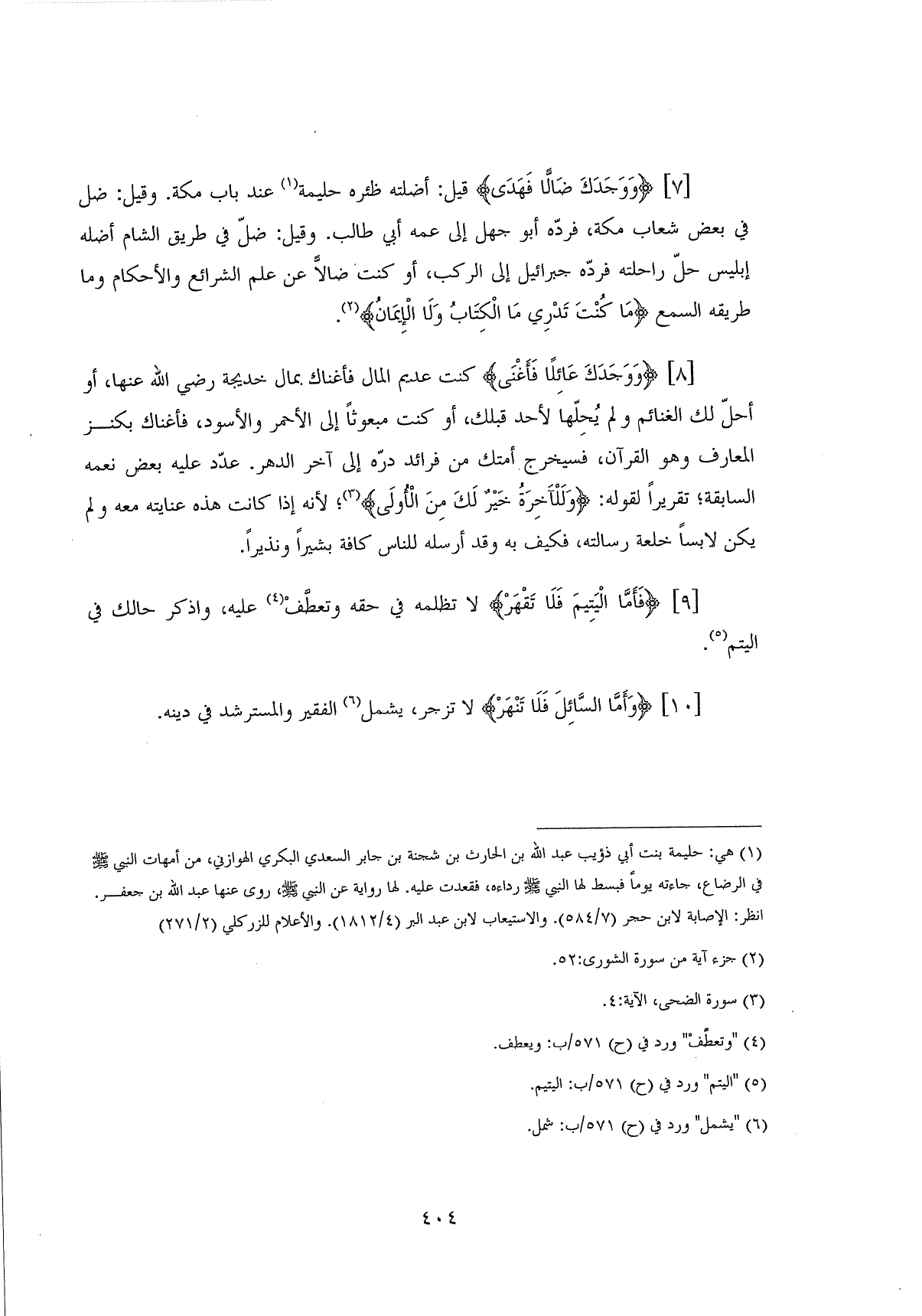 (وَوَجَدَكَ ضَالًّا فَهَدَى (7) قيل: أضلته ظئره حليمة عند باب مكة. وقيل: ضل في بعض شعاب مكة، فردّه أبو جهل إلى عمه أبي طالب. وقيل: ضلّ في طريق الشام أضله إبليس حلِّ راحلته فردّه جبرائيل إلى الركب، أو كنت ضالاًّ عن علم الشرائع والأحكام وما طريقه السمع (مَا كُنْتَ تَدْرِي مَا الْكِتَابُ وَلَا الْإِيمَانُ).