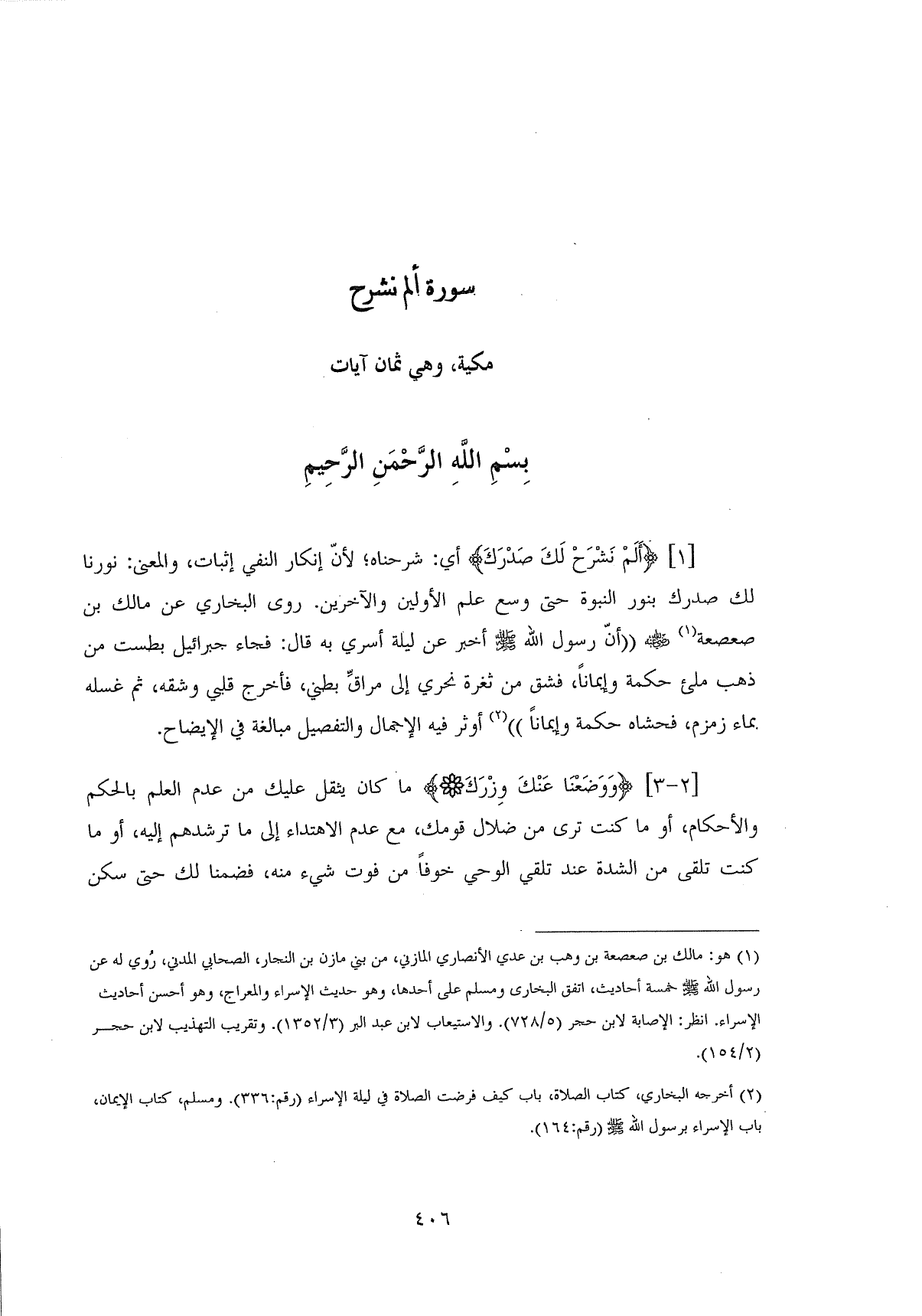 أَلَمْ نَشْرَحْ لَكَ صَدْرَكَ (1) أي: شرحناه؛ لأنَّ إنكار النفي إثبات، والمعنى: نورنا لك صدرك بنور النبوة حتى وسع علم الأولين والآخرين. روى البخاري عن مالك بن صعصعة - رضي الله عنه - " أنَّ رسول اللَّه - صلى الله عليه وسلم - أخبر عن ليلة أسري به قال. فجاء جبرائيل بطست من ذهب ملئ حكمة وإيماناً، فشق من ثغرة نحري إلى مراقِّ بطني، فأخرج قلبي وشقه، ثم غسله بماء زمزم، فحشاه حكمة وإيماناً " أوثر فيه الإجمال والتفضيل مبالغة في الإيضاح.
