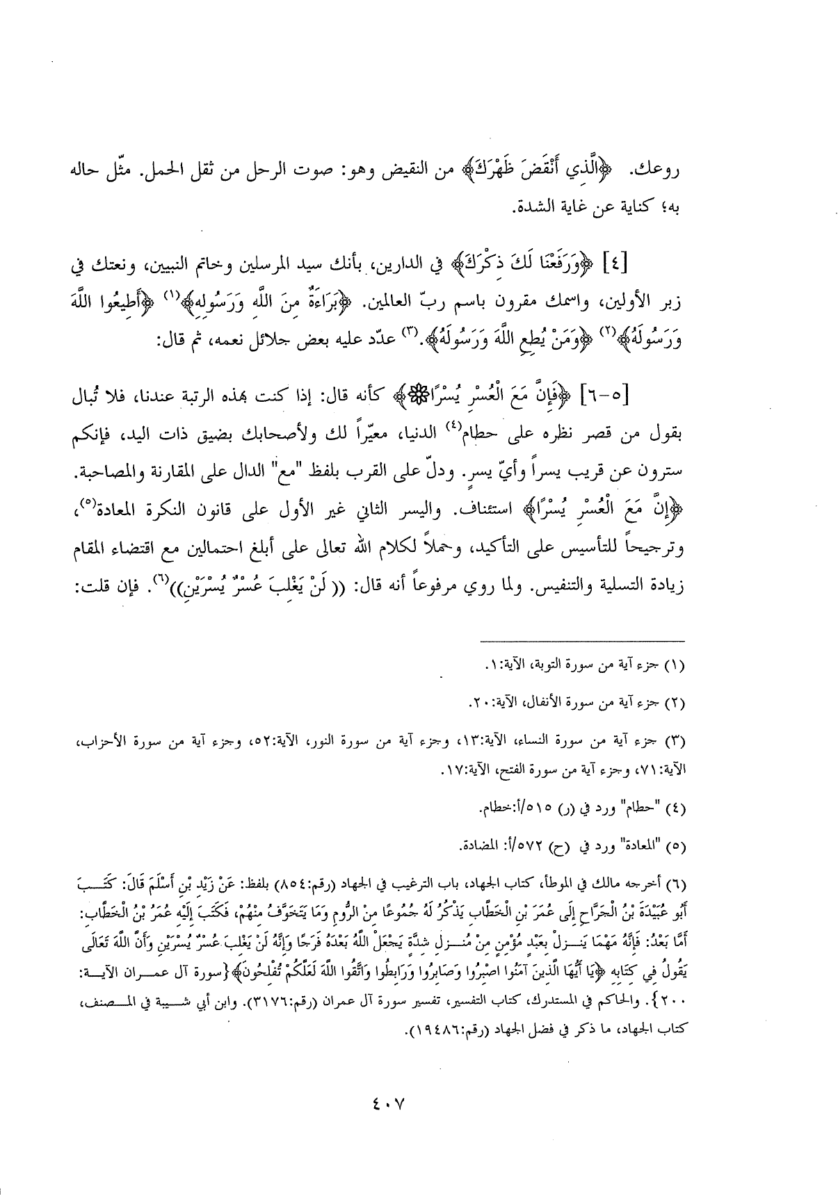 (فَإِنَّ مَعَ الْعُسْرِ يُسْرًا (5) كأنه قال: إذا كنت بهذه الرتبة عندنا، فلا تُبال بقول من قصر نظره على حطام الدنيا، معيّراً لك ولأصحابك بضيق ذات اليد، فإنكم سترون عن قريب يسراً وأيّ يسرٍ. ودل على القرب بلفظ " مع " الدال على المقارنة والمصاحبة.