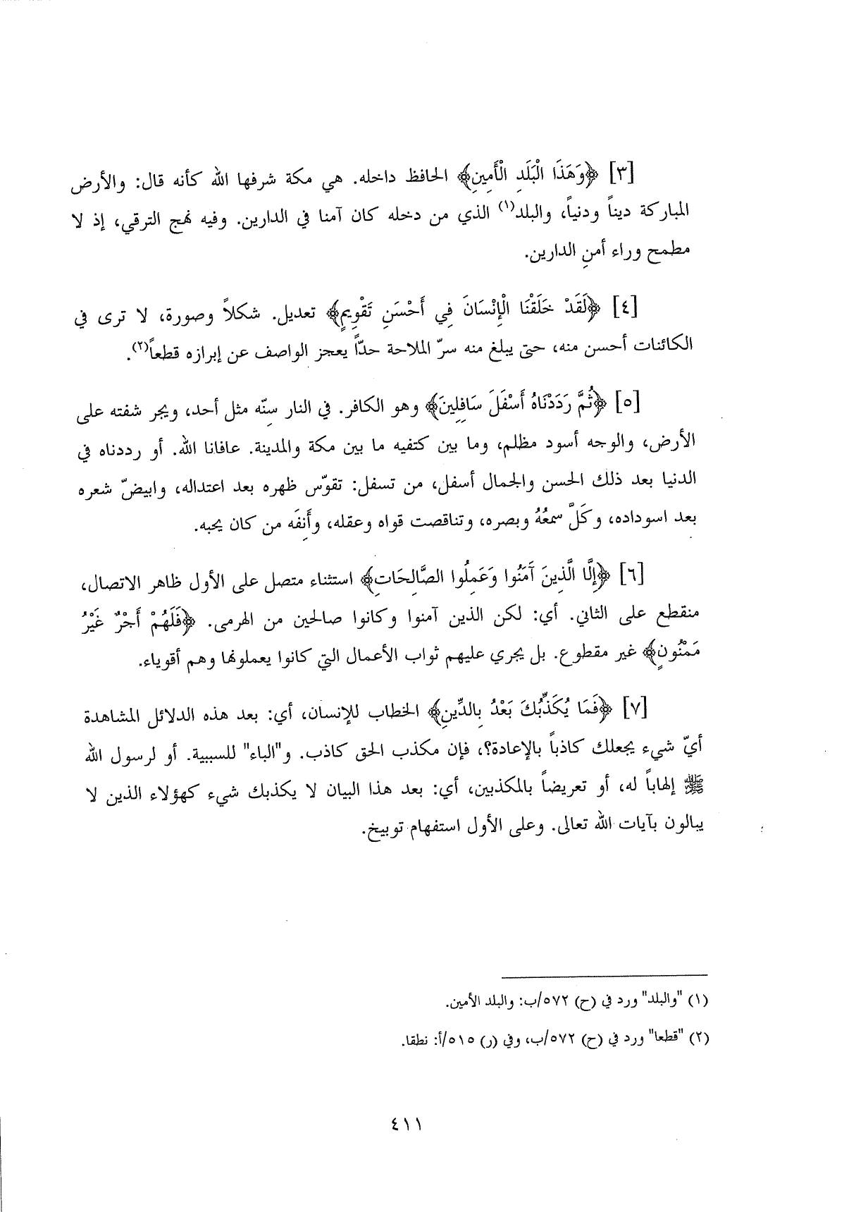(وَهَذَا الْبَلَدِ الْأَمِينِ (3) الحافظ داخله. هي مكة شرفها اللَّه كأنه قال: والأرض المباركة ديناً ودنياً، والبلد الذي من دخله كان آمنا في الدارين. وفيه نهج الترقي، إذ لا مطمح وراء أمنِ الدارين.