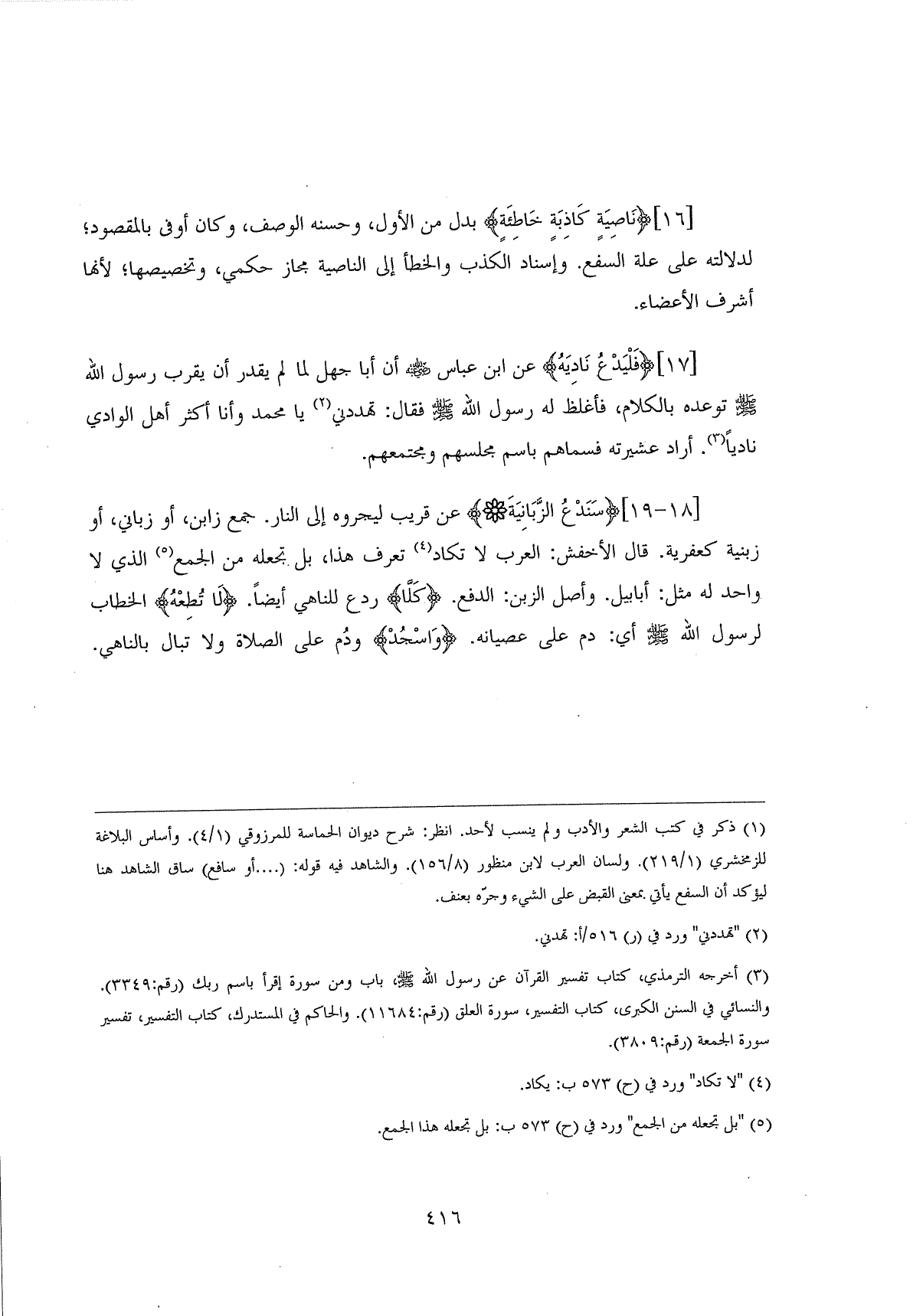 (فَلْيَدْعُ نَادِيَهُ (17) عن ابن عباس - رضي الله عنهما - أن أبا جهل لما لم يقدر أن يقرب رسول اللَّه - صلى الله عليه وسلم - توعده بالكلام، فأغلظ له رسول اللَّه - صلى الله عليه وسلم - فقال: تهددني يا محمد وأنا أكثر أهل الوادي نادياً. أراد عشيرته فسماهم باسم مجلسهم ومجتمعهم.