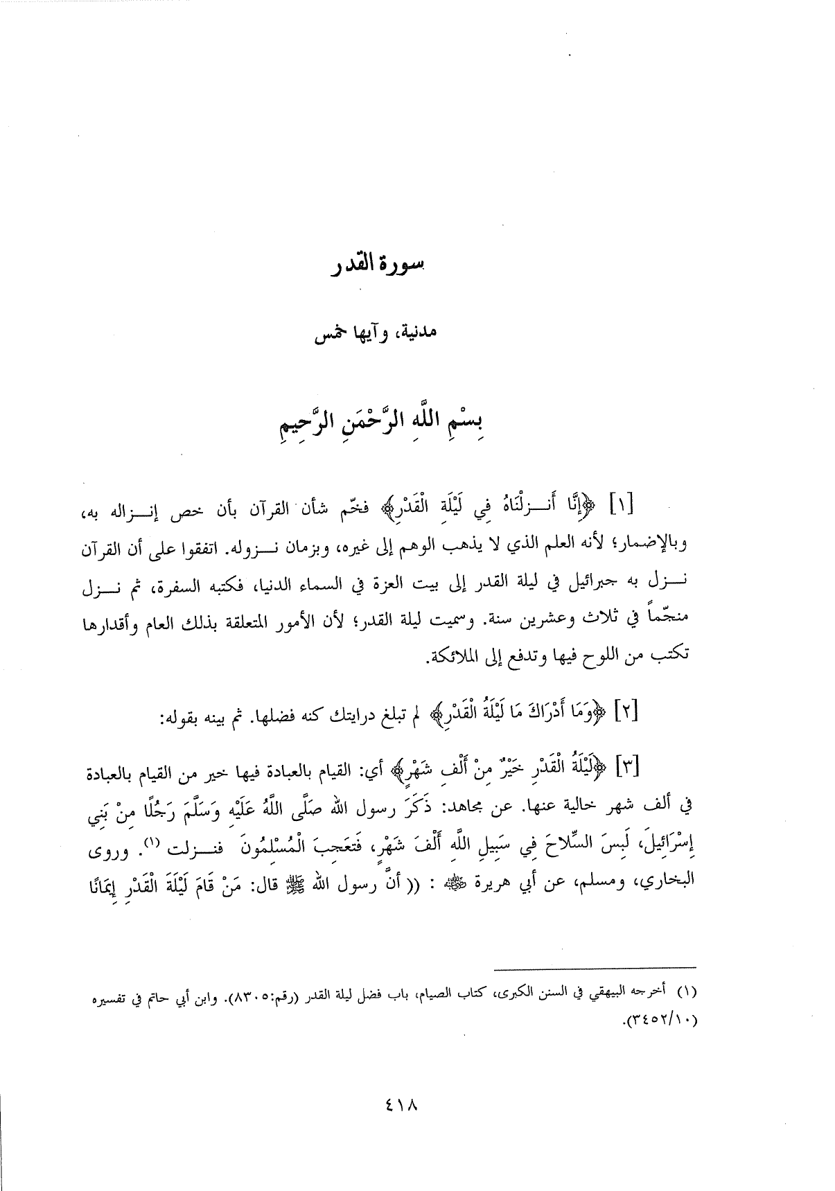(لَيْلَةُ الْقَدْرِ خَيْرٌ مِنْ أَلْفِ شَهْرٍ (3) أي: القيام بالعبادة فيها خير من القيام بالعبادة في ألف شهر خالية عنها. عن مجاهد: ذَكَرَ رسول اللَّه - صلى الله عليه وسلم - رَجلًا مِنْ بَنِي إِسرَائِيلَ، لَبِسَ السِّلاحَ فِي سَبِيلِ اللَّهِ أَلْفَ شَهْرٍ، فَتعَجِبَ الْمُسلِمُونَ فنزلت. وروى البخاري، ومسلم، عن أبي هريرة - رضي الله عنه -: " أن رسول اللَّه - صلى الله عليه وسلم - قال: مَنْ قَامَ لَيلَة الْقَدْرِ إيمانًا