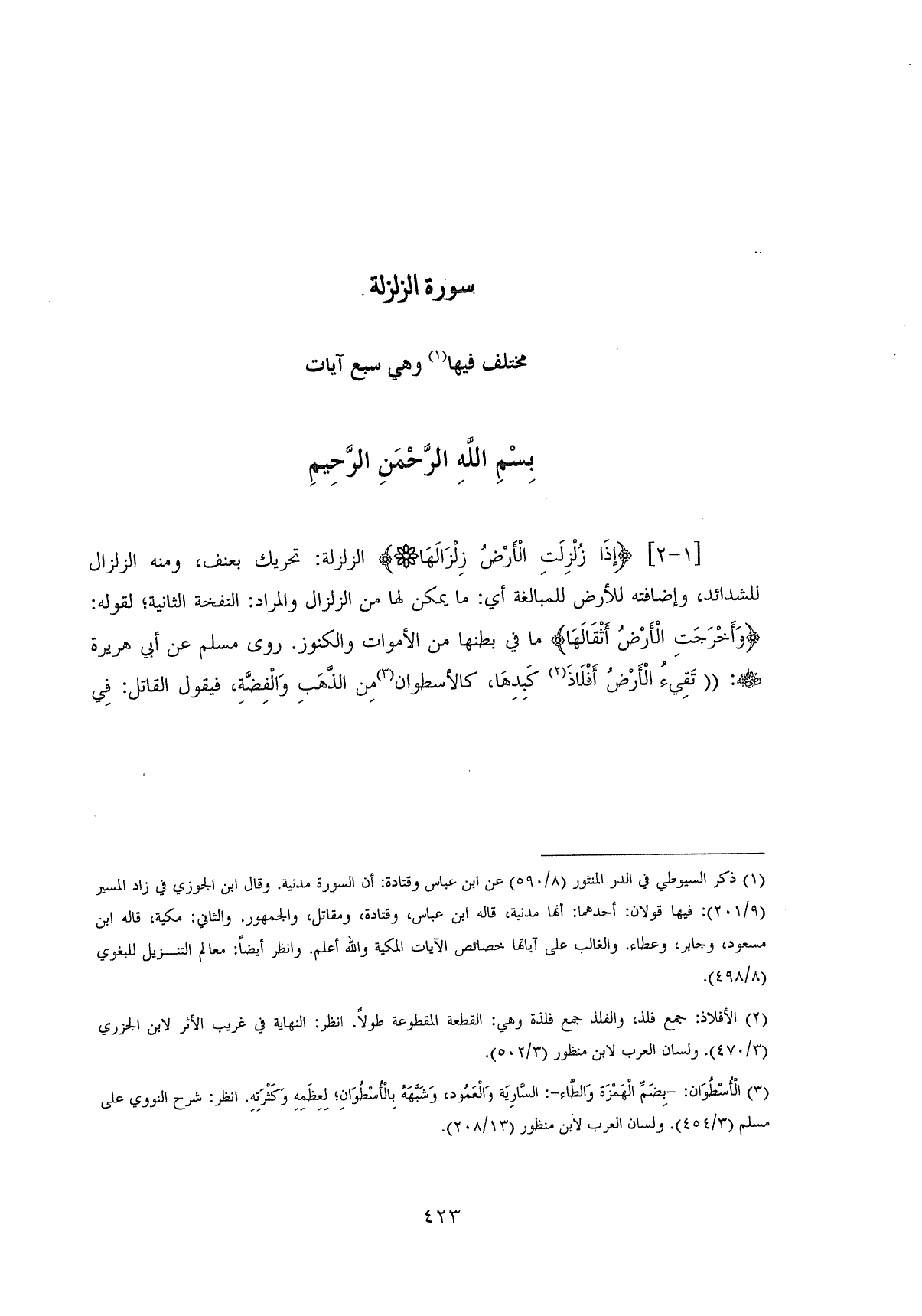 إِذَا زُلْزِلَتِ الْأَرْضُ زِلْزَالَهَا (1) الزلزلة: تحريك بعنف، ومنه الزلزال للشدائد، وإضافته للأرض للمبالغة أي: ما يمكن لها من الزلزال والمراد: النفخة الثانية؛ لقوله: (وَأَخْرَجَتِ الْأَرْضُ أَثْقَالَهَا (2) ما في بطنها من الأموات والكنوز. روى مسلم عن أبي هريرة - رضي الله عنه -: " تَقِيءُ الأَرْضُ أَفْلَاذَ كَبِدِهَا، كالأسطوان مِن الذهبِ وَالْفِضَّةِ، فيقول القاتل: فِي