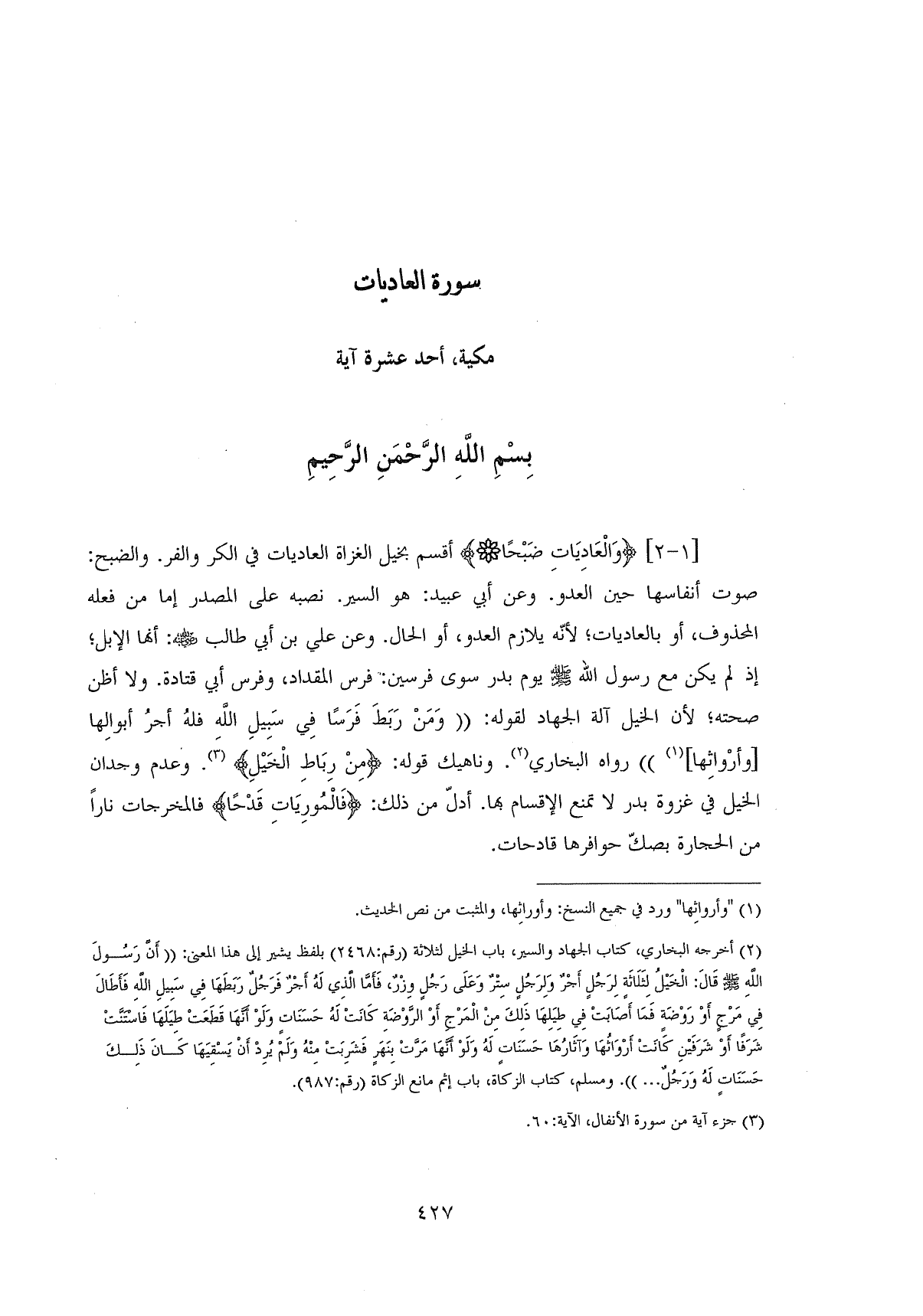وَالْعَادِيَاتِ ضَبْحًا (1) أقسم بخيل الغزاة العاديات في الكر والفر. والضبح: صوت أنفاسها حين العدو. وعن أبي عبيد: هو السير. نصبه على المصدر إما من فعله المحذوف، أو بالعاديات؛ لأنّه يلازم العدو، أو الحال. وعن علي بن أبي طالب - رضي الله عنه -: أنها الإبل؛ إذ لم يكن مع رسول اللَّه - صلى الله عليه وسلم - يوم بدر سوى فرسين: فرس المقداد، وفرس أبي قتادة. ولا أظن صحته؛ لأن الخيل آلة الجهاد لقوله: " وَمَنْ رَبَطَ فَرَسًا فِي سَبِيلِ اللَّه فلهُ أجرُ أبوالِها وأرْواثِها " رواه البخاري. وناهيك قوله. (مِنْ رِبَاطِ الْخَيْلِ)، وعدم وجدان الخيل في غزوة بدر لا تمنع الإقسام بها. أدلّ من ذلك: (فَالْمُورِيَاتِ قَدْحًا (2) فالمخرجات ناراً من الحجارة بصكِّ حوافرها قادحات.