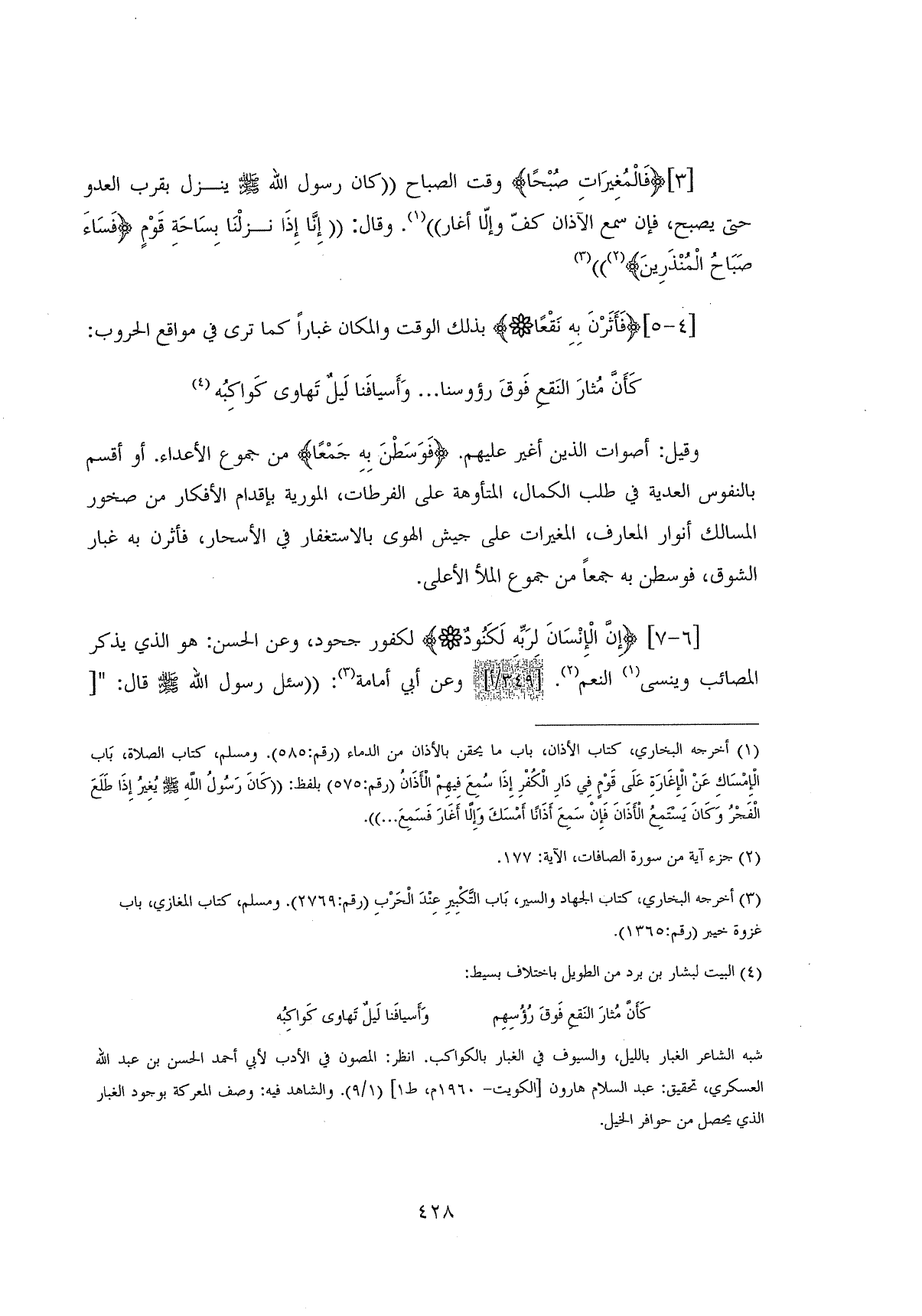 (فَالْمُغِيرَاتِ صُبْحًا (3) وقت الصباح " كان رسول اللَّه - صلى الله عليه وسلم - ينزل بقرب العدو حتى يصبح، فإن سمع الآذان كفَّ وإلَّا أغار ". وقال: " إِنَّا إِذا نزلْنَا بسَاحَة قَوْمٍ (فَسَاءَ صَباح الْمُنْذَرِينَ) ".