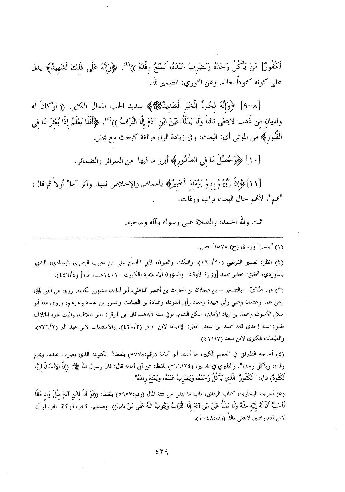 (وَإِنَّهُ لِحُبِّ الْخَيْرِ لَشَدِيدٌ (8) شديد الحب للمال الكثير. "لوْ كانَ له واديان مِن ذَهب لابتغَى ثالثاً وَلَا يَمْلَأ عَيْنَ ابْنِ آدَمَ إِلا التُّرَابُ ". (أَفَلَا يَعْلَمُ إِذَا بُعْثِرَ مَا فِي الْقُبُورِ (9) [من الموتى أي: البعث، وفي زيادة الراء مبالغة كبحث مع بحثر].