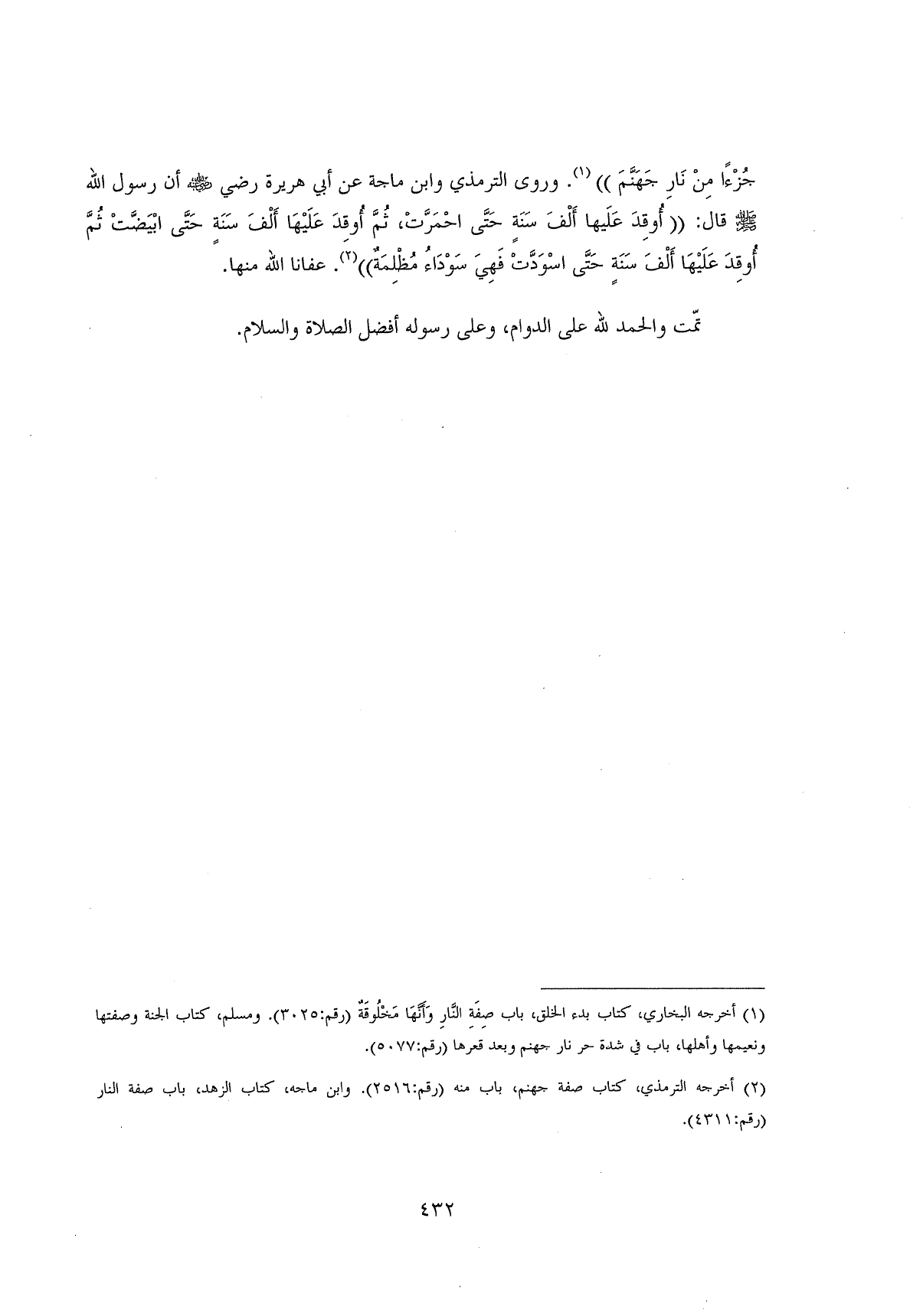 جُزءاً مِنْ نَارِ جَهَنِّمَ ". وروى الترمذي وابن ماجة عن أبي هريرة - رضي الله عنه - أن رسول اللَّه - صلى الله عليه وسلم - قال: " أُوقِدَ عَلَيها أَلف سَنَةٍ حَتَّى احْمَرَّت، ثُمَّ أُوقدَ عَلَيْهَا أَلْفَ سَنَةٍ حَتَّى ابْيَضَّت ثُمَّ أُوقِدَ عَلَيْهَا أَلْفَ سَنَة حَتى اسْوَدَّتْ فَهِيَ سَودَاءُ مظْلِمَة " عفانا اللَّه منها.