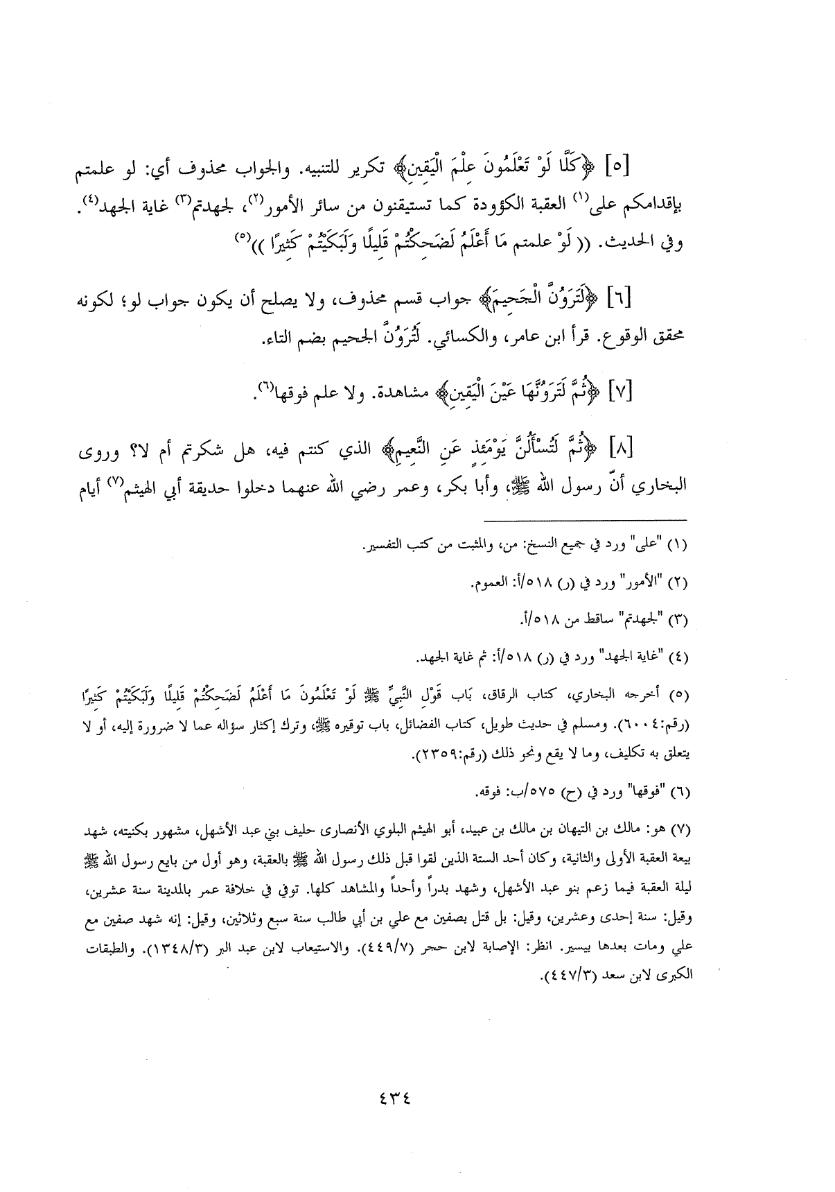 (ثُمَّ لَتُسْأَلُنَّ يَوْمَئِذٍ عَنِ النَّعِيمِ (8) الذي كنتم فيه، هل شكرتم أم لا؟ وروى البخاري أنَّ رسول اللَّه - صلى الله عليه وسلم -، وأبَا بكر، وعمر رضي اللَّه عنهما دخلوا حديقة أبي الهيثم أيام
