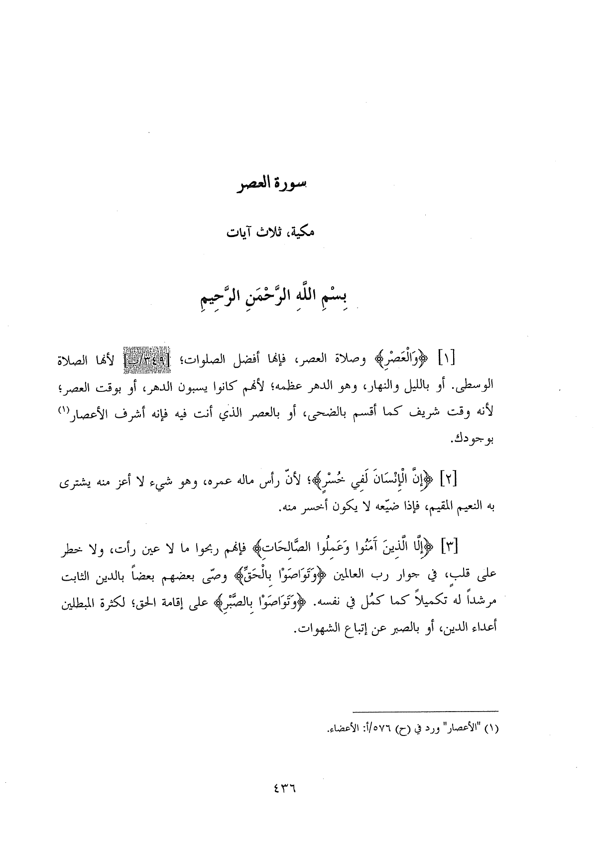 وَالْعَصْرِ (1) وصلاة العصر، فإنها أفضل الصلوات؛ لأنها الصلاة الوسطى. أو بالليل والنهار، وهو الدهر عظمه؛ لأنهم كانوا يسبون الدهر، أو بوقت العصر؛ لأنه وقت شريف كما أقسم بالضحى، أو بالعصر الذي أنت فيه فإنه أشرف الأعصار بوجودك.