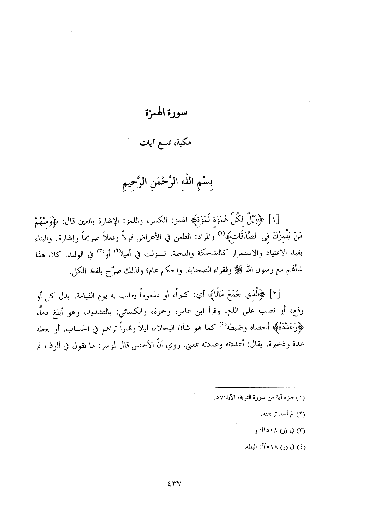 وَيْلٌ لِكُلِّ هُمَزَةٍ لُمَزَةٍ (1) الهمز: الكسر، واللمز: الإشارة بالعين قال: (وَمِنْهُمْ مَنْ يَلْمِزُكَ فِي الصَّدَقَاتِ) والمراد: الطعن في الأعراض قولاً وفعلاً صريحاً وإشارة. والبناء يفيد الاعتماد والاستمرار كالضحكة واللحنة. نزلت في أمية أو في الوليد. كان هذا شأنهم مع رسول اللَّه - صلى الله عليه وسلم - وفقراء الصحابة. والحكم عام؛ ولذلك صرّح بلفظ الكل.