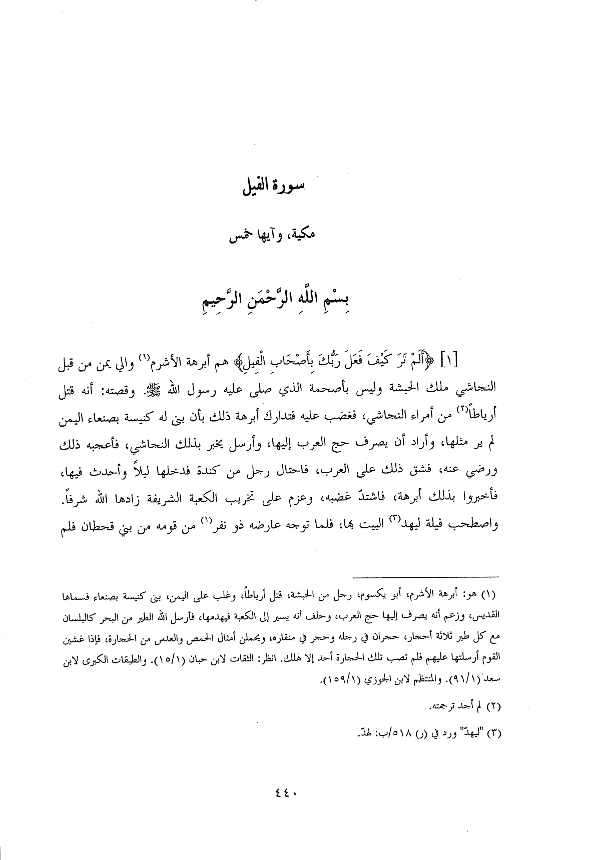 (أَلَمْ تَرَ كَيْفَ فَعَلَ رَبُّكَ بِأَصْحَابِ الْفِيلِ (1) هم أبرهة الأشرم والي [اليمن] من قبل النجاشي ملك الحيشة وليس بأصحمة الذي صلى عليه رسول اللَّه - صلى الله عليه وسلم -. وقصته: أنه قتل أرياطاً من أمراء النجاشي، فغضب عليه فتدارك أبرهة ذلك بأن بنى له كنيسة بصنعاء اليمن لم ير مثلها، وأراد أن يصرف حج العرب إليها، وأرسل يخبر بذلك النجاشي، فأعجبه ذلك ورضي عنه، فشق ذلك على العرب، فاحتال رجل من كندة فدخلها ليلاً وأحدث فيها، فأخبروا بذلك أبرهة، فاشتدّ غضبه، وعزم على تخريب الكعبة الشريفة زادها اللَّه شرفاً. واصطحب فيلة ليهد البيت بها، فلما توجه عارضه ذو نفر من قومه من بني قحطان فلم ......