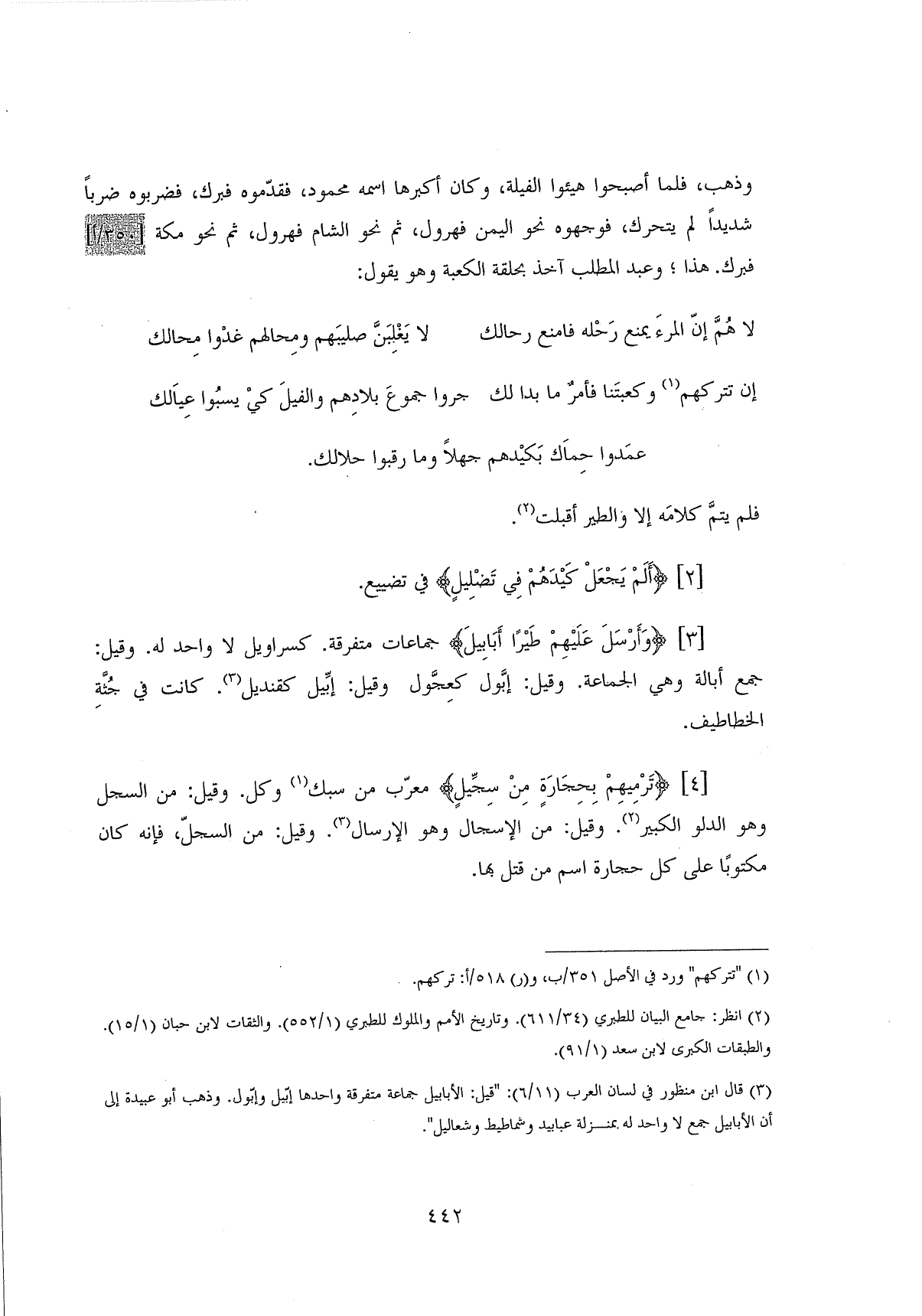 (وَأَرْسَلَ عَلَيْهِمْ طَيْرًا أَبَابِيلَ (3) جماعات متفرقة. كسراويل لا واحد له. وقيل: جمع أبالة وهي الجماعة. وقيل: إبَّول كعِجَّول وقيل: إبِّيل كقنديل. كانت في جُثَّة الخطاطيف.