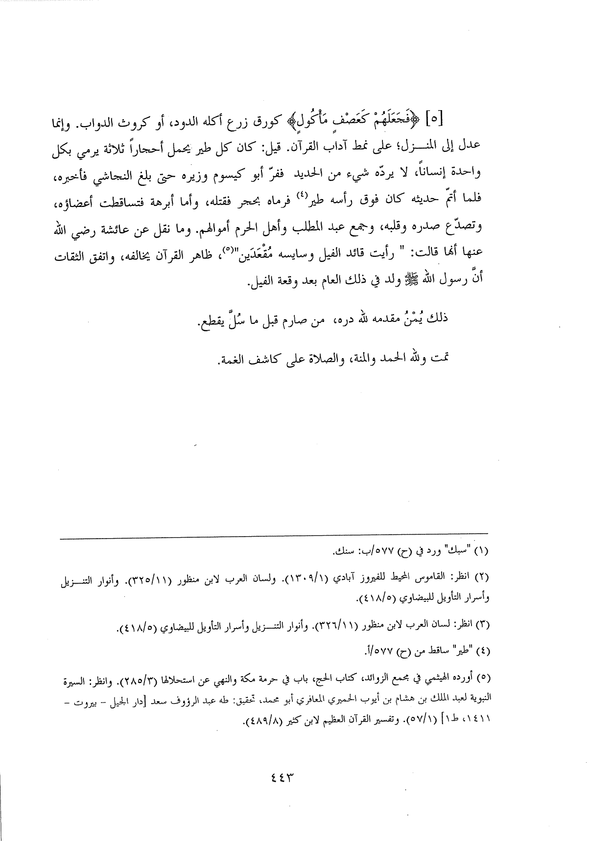 (فَجَعَلَهُمْ كَعَصْفٍ مَأْكُولٍ (5) كورق زرع أكله الدود، أو كروث الدواب. وإنما عدل إلى المنزل؛ على نمط آداب القرآن. قيل: كان كل طير يحمل أحجاراً ثلاثة يرمي بكل واحدة إنساناً، لا يردّه شيء من الحديد ففرّ أبو كيسوم وزيره حتى بلغ النجاشي فأخبره، فلما أتمّ حديثه كان فوق رأسه طير فرماه بحجر فقتله، وأما أبرهة فتساقطت أعضاؤه، وتصدّع صدره وقلبه، وجمع عبد المطلب وأهل الحرم أموالهم. وما نقل عن عائشة رضى اللَّه عنها أنها قالت: " رأيت قائد الفيل وسايسه مُقْعَدَين "، ظاهر القرآن يخالفه، واتفق الثقات أن رسول اللَّه - صلى الله عليه وسلم - ولد في ذلك العام بعد وقعة الفيل.