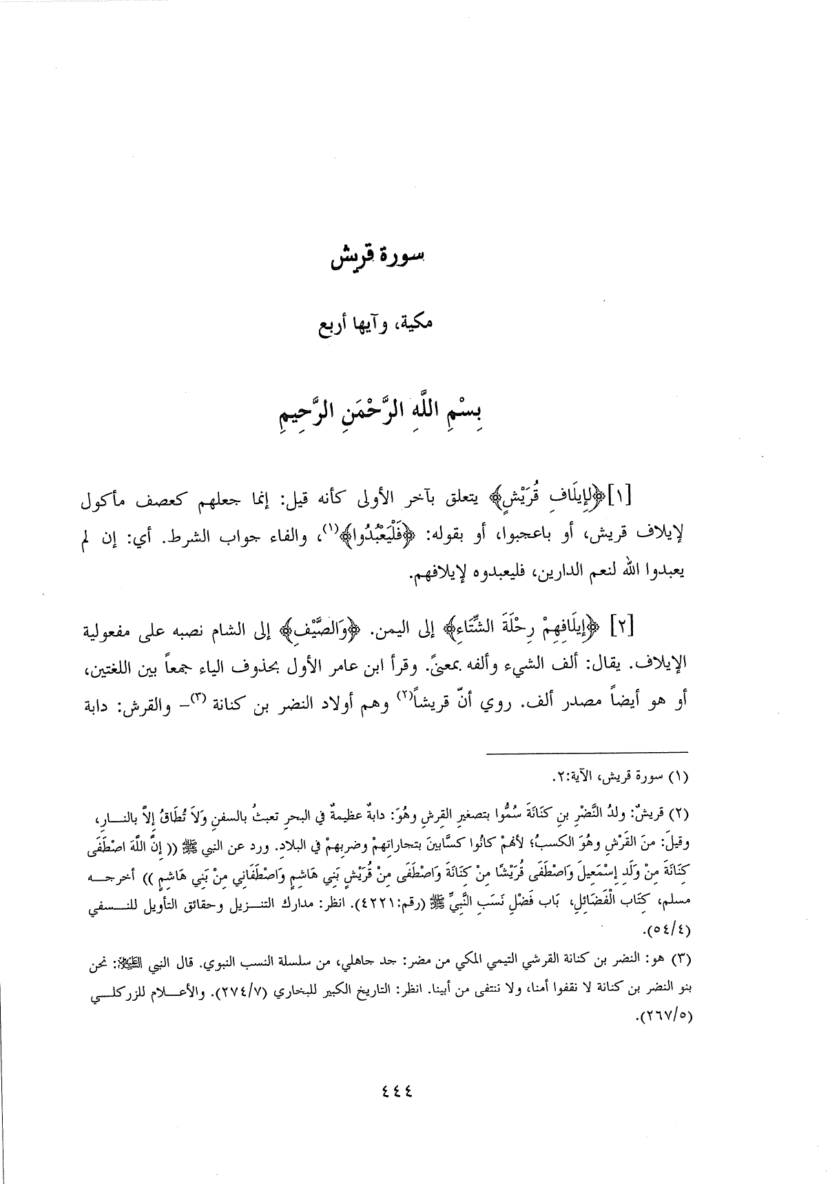 لِإِيلَافِ قُرَيْشٍ (1) يتعلق بآخر الأولى كأنه قيل: إنما جعلهم كعصف مأكول لإيلاف قريش، أو باعجبوا، أو بقوله: (فَلْيَعبدوا)، والفاء جواب الشرط. أي: إن لم يعبدوا اللَّه لنعم الدارين، فليعبدوه لإيلافهم.