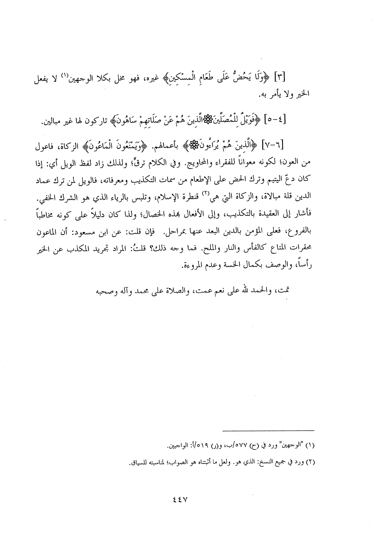 (الَّذِينَ هُمْ يُرَاءُونَ (6) بأعمالهم. (وَيَمْنَعُونَ الْمَاعُونَ (7) الزكاة، فاعول من العون؛ لكونه معواناً للفقراء والمحاويج. وفي الكلام ترقٍّ؛ ولذلك زاد لفظ الويل أي: إذا كان دعّ اليتيم وترك الحض على الإطعام من سمات التكذيب ومعرفاته، فالويل لمن ترك عماد الدين قلة مبالاة، والزكاة التي هي قنطرة الإسلام، وتلبس بالرياء الذي هو الشرك الخفي. فأشار إلى العقيدة بالتكذيب، وإلى الأفعال بهذه الخصال؛ ولذا كان دليلاً على كونه مخاطباً بالفروع، فعلى المؤمن بالدين البعد عنها بمراحل. فإن قلت: عن ابن مسعود: أن الماعون محقرات المتاع كالفأس والنار والملح. فما وجه ذلك؟ قلتُ: المراد تجريد المكذب عن الخير رأساً، والوصف بكمال الخسة وعدم المروءة.