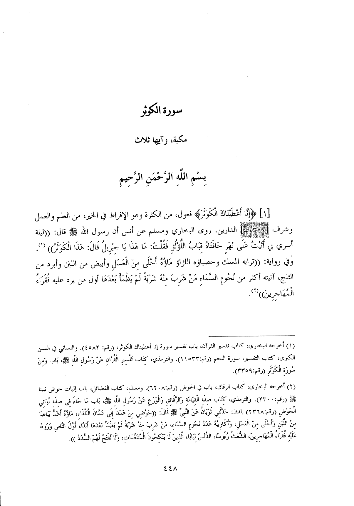 (إِنَّا أَعْطَيْنَاكَ الْكَوْثَرَ (1) فعول، من الكثرة وهو الإفراط في الخير، من العلم والعمل وشرف الدارين. روى البخاري ومسلم عن أنس أن رسول اللَّه - صلى الله عليه وسلم - قال: " ليلة أسري بي أَتَيْتُ علَى نَهَرٍ حَافَتَاهُ قِبَاب اللؤلؤِ فَقُلْتُ: مَا هَذا يَا جِبْرِيلُ قَالَ: هَذَا الْكَوْثَرُ ". وفي رواية: " ترابه المسك وحصباؤه اللؤلؤ مَاؤُهُ أَحْلَى مِنْ الْعَسلِ وأبيضُ من اللن وأبرد من الثلج، آنيته أكثر من نُجُومِ السَّمَاءِ مَنْ شَرِبَ مِنْهُ شَرْبَةً لَمْ يَظمَأ بَعْدَهَا أول من يرد عليه فُقَرَاءُ الْمُهَاجِرِينَ ".
