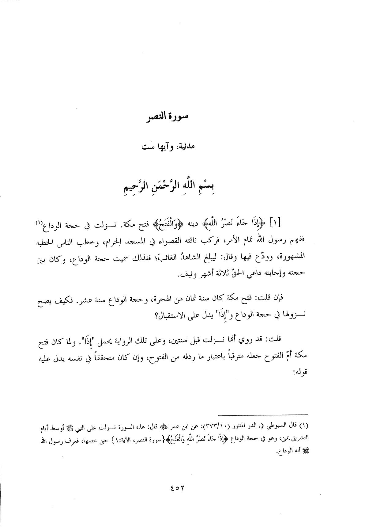 إِذَا جَاءَ نَصْرُ اللَّهِ ... (1) دينه (وَالْفَتْحُ) فتح مكة. نزلت في حجة الوداع ففهم رسول اللَّه تمام الأمر، فركب ناقته القصواء في المسجد الحرام، وخطب الناس الخطبة المشهورة، وودّع فيها وقال: ليبلغ الشاهدُ الغائبَ؛ فلذلك سميت حجة الوداع، وكان بين حجته وإجابته داعي الحقِّ ثلاثة أشهر ونيف.