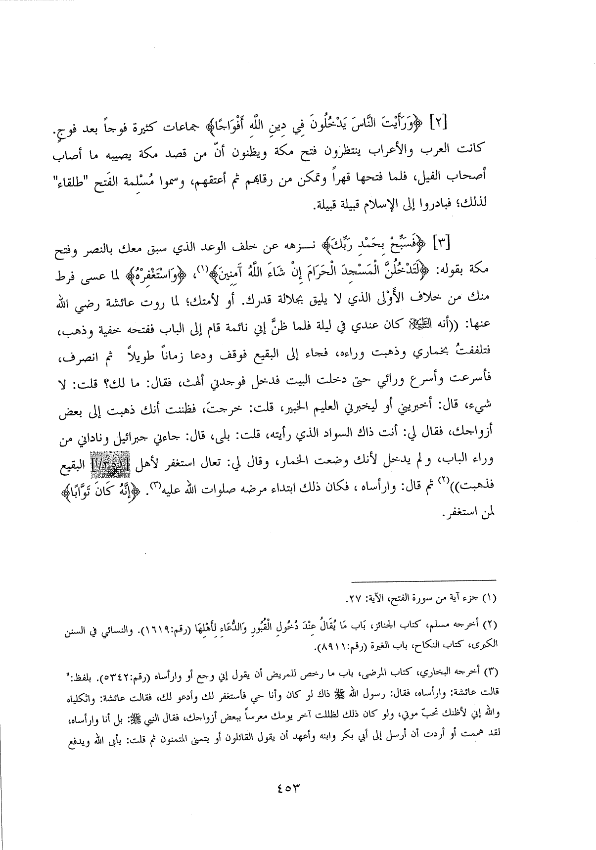 (فَسَبِّحْ بِحَمْدِ رَبِّكَ ... (3) نزهه عن خلف الوعد الذي سبق معك بالنصر وفتح مكة بقوله: (لَتَدْخُلُنَّ الْمَسْجِدَ الْحَرَامَ إِنْ شَاءَ اللَّهُ آمِنِينَ)، (وَاسْتَغْفِرْهُ) لما عسى فرط منك من خلاف الأَوْلى الذي لا يليق بجلالة قدرك. أو لأمتك؛ لما روت عائشة رضي اللَّه عنها: " أنه - صلى الله عليه وسلم - كان عندي في ليلة فلما ظنَّ أني نائمة قام إلى الباب ففتحه خفية وذهب، فتلففتُ بخماري وذهبت وراءه، فجاء إلى البقيع فوقف ودعا زماناً طويلاً ثم انصرف، فأسرعت وأسرع ورائي حتى دخلت البيت فدخل فوجدني ألهث، فقال " ما لك؟ قلت. لا شيء، قال: أخبريني أو ليخبرني العليم الخبير، قلت: خرجت، فظننت أنك ذهبت إلى بعض أزواجك فقال لي: أنت ذاك السواد الذي رأيته؟ قلت: بلى، قال: جاءني جبرائيل وناداني من وراء الباب، ولم يدخل لأنك وضعت الخمار، وقال لي: تعال استغفر لأهل البقيع فذهبت " ثم قال: وارأساه، فكان ذلك ابتداء مرضه صلوات اللَّه عليه. (إِنَّهُ كَانَ تَوَّابًا) لمن استغفر.
