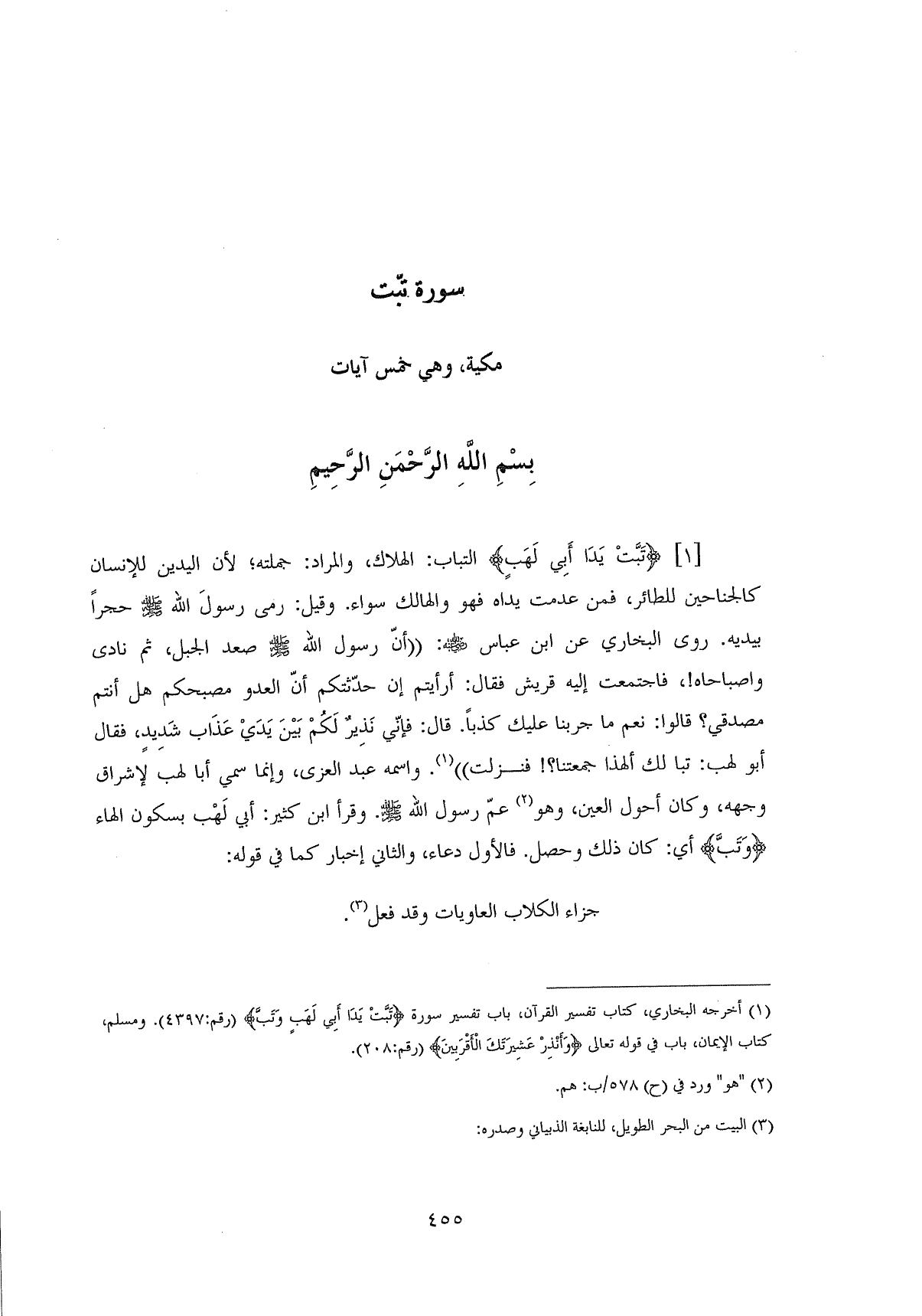 (تَبَّتْ يَدَا أَبِي لَهَبٍ ... (1) التباب: الهلاك، والمراد: جملته؛ لأن اليدين للإنسان كالجناحين للطائر، فمن عدمت يداه فهو والهالك سواء. وقيل: رمى رسول اللَّه - صلى الله عليه وسلم - حجراً بيديه. روى البخاري عن ابن عباس - رضي الله عنهما -: " أنِّ رسول اللَّه - صلى الله عليه وسلم - صعد الجبل، ثم نادى واصباحاه!، فاجتمعت إليه قريش فقال: أرأيتم إن حدّثتكم أنَّ العدو مصبحكم هل أنتم مصدقي؟ قالوا: نعم ما جربنا عليك كذباً. قال: فإنّي نَذِيرٌ لَكمْ بَيْنَ يَدَي عَذابٍ شَدِيدٍ، فقال أبو لهب. تبًّا لك ألهذا جمعتنا؟! فنزلت ". واسمه عبد العزى، وإنما سمي أبا لهب لَإشراق وجهه، وكان أحول العين، وهو عمّ رسول اللَّه - صلى الله عليه وسلم -. وقرأ ابن كثير: (أبي لَهْبٍ) بسكون الهاء (وَتَبَّ) أي: كان ذلك وحصل. فالأول دعاء، والثاني إخبار كما في قوله: