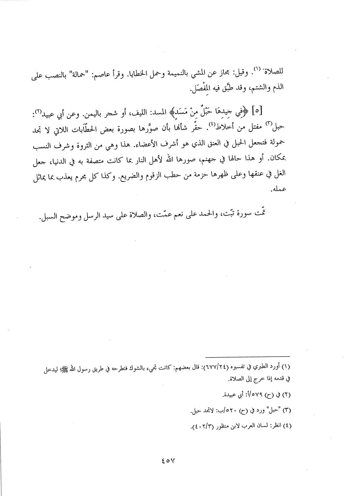 تمت سورة تَبَّتْ، والحمد على نعم عمَّت، والصلاة على سيد الرسل وموضح السُّبل.