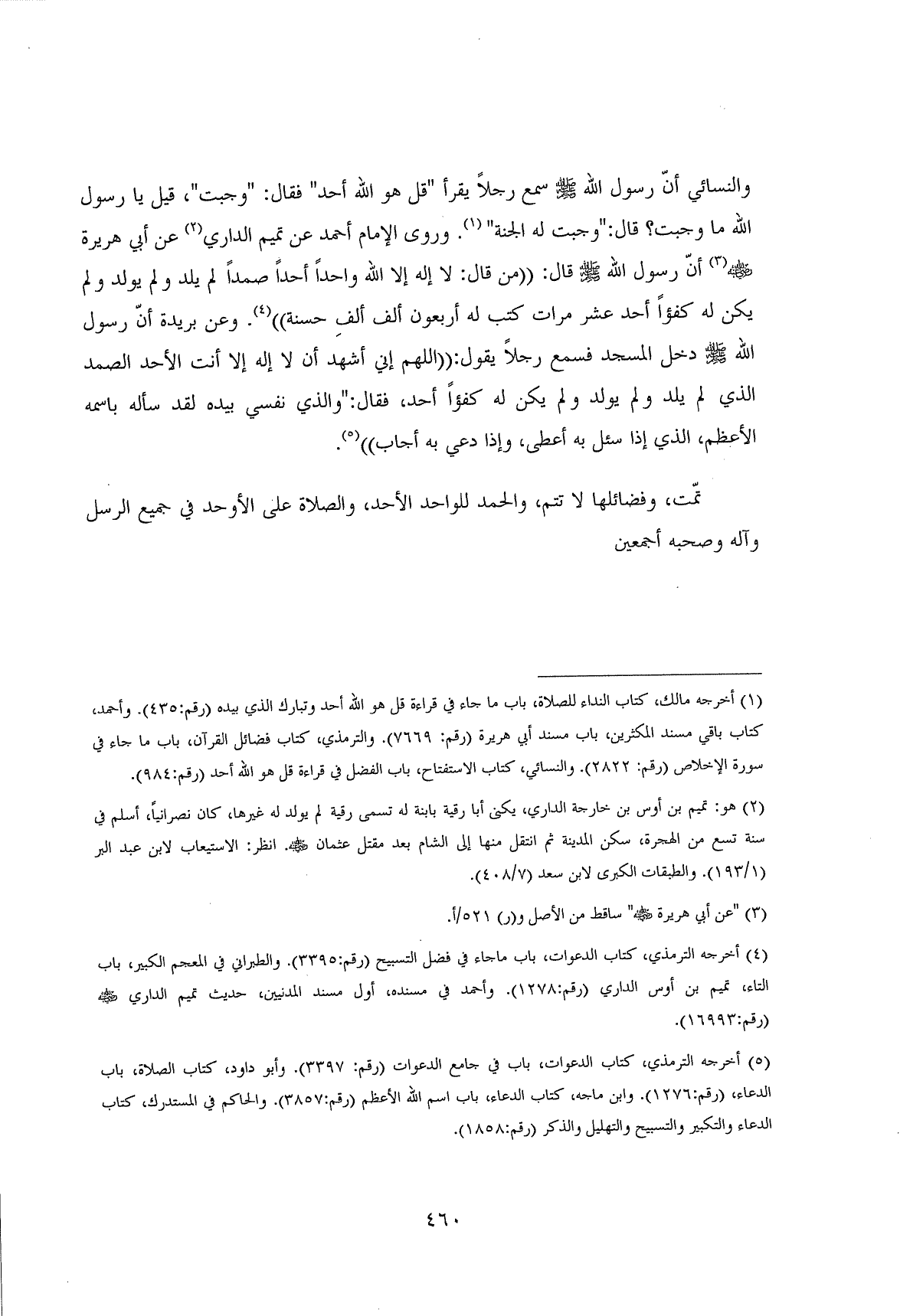 والنسائي أنَّ رسول اللَّه - صلى الله عليه وسلم - سمع رجلاً يقرأ " قل هو اللَّه أحد " فقال: " وجبت "، قيل يا رسول اللَّه ما وجبت؟ قال: " وجبت له الجنة "، وروى الإمام أحمد عن تميم الداري عن أبي هريرة - رضي الله عنه - أنَّ رسول اللَّه - صلى الله عليه وسلم - قال: " من قال: لا إله إلا اللَّه واحداً أحداً صمداً لم يلد ولم يولد ولم يكن له كفؤاً أحد عشر مرات كتب له أربعون ألف ألفِ حسنة " وعن بريدة أنَّ رسول اللَّه - صلى الله عليه وسلم - دخل المسجد فسمع رجلاً يقول: " اللَّهم إني أشهد أن لا إله إلا أنت الأحد الصمد الذي لم يلد ولم يولد ولم يكن له كفؤاً أحد، فقال: " والذي نفسي بيده لقد سأله باسمه الأعظم، الذي إذا سئل به أعطى، وإذا دعي به أجاب ".