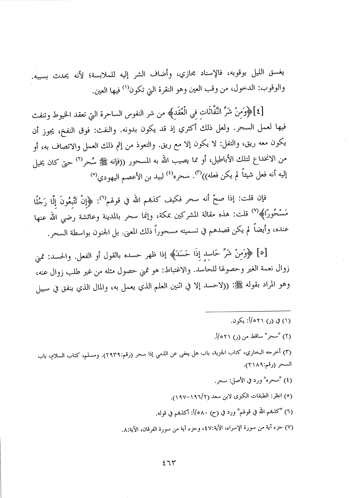 (وَمِنْ شَرِّ النَّفَّاثَاتِ فِي الْعُقَدِ (4) من شر النفوس الساحرة التي تعقد الخيوط وتنفث فيها لعمل السحر. ولعل ذلك أكثري إذ قد يكون بدونه. والنفث: فوق النفخ، يجوز أن يكون معه ريق، والتفل: لا يكون إلا مع ريق. والتعوذ من إثم ذلك العمل والاتصاف به، أو من الانخداع لتلك الأباطيل، أو مما يصيب اللَّه به المسحور " فإنه سُحر حتى كان يخيل إليه أنه فعل شيئاً لم يكن فعله ". سحره لبيد بن الأعصم اليهودي.