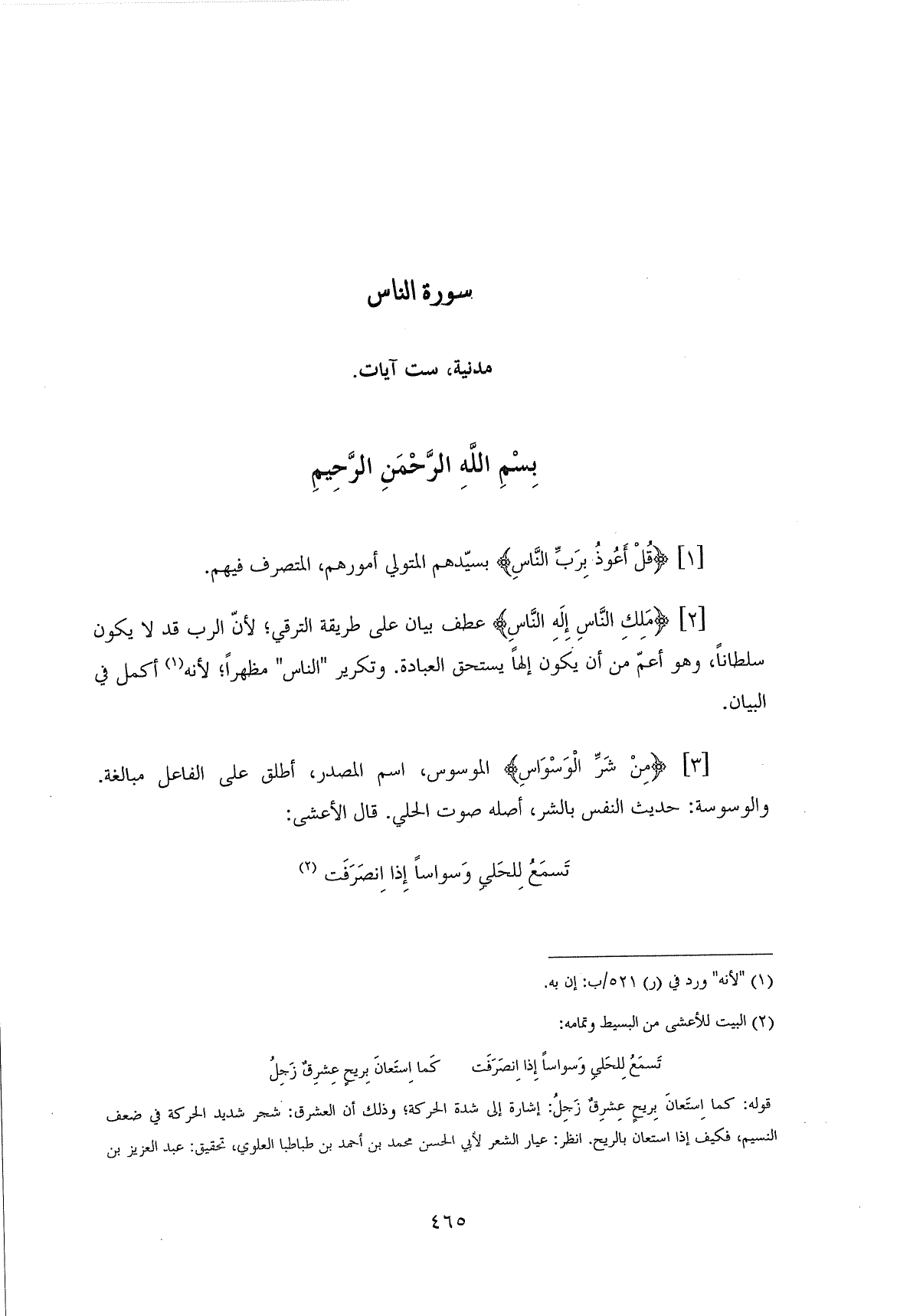 (مَلِكِ النَّاسِ (2) إِلَهِ النَّاسِ (3) عطف بيان على طريقة الترقي؛ لأنَّ الرب قد لا يكون سلطاناً، وهو أعمّ من أن يكون إلهاً يستحق العبادة. " وتكرير " الناس " مظهراً؛ لأنه أكمل في البيان.