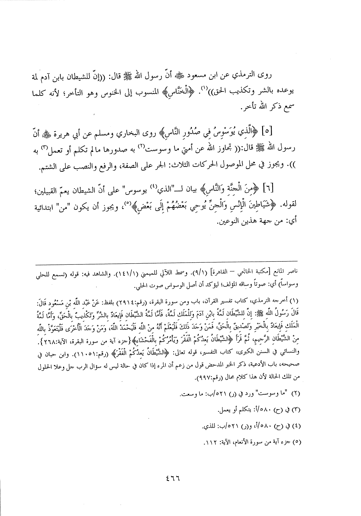 روى الترمذي عن ابن مسعود - رضي الله عنه - أنَّ رسول اللَّه - صلى الله عليه وسلم - قال: " إنَّ للشيطان بابن آدم لمة يوعده بالشر وتكذيب الحق ". (الْخَنَّاسِ) المنسوب إلى الخنوس وهو التأخر؛ لأنه كلما سمع ذكر اللَّه تأخر.