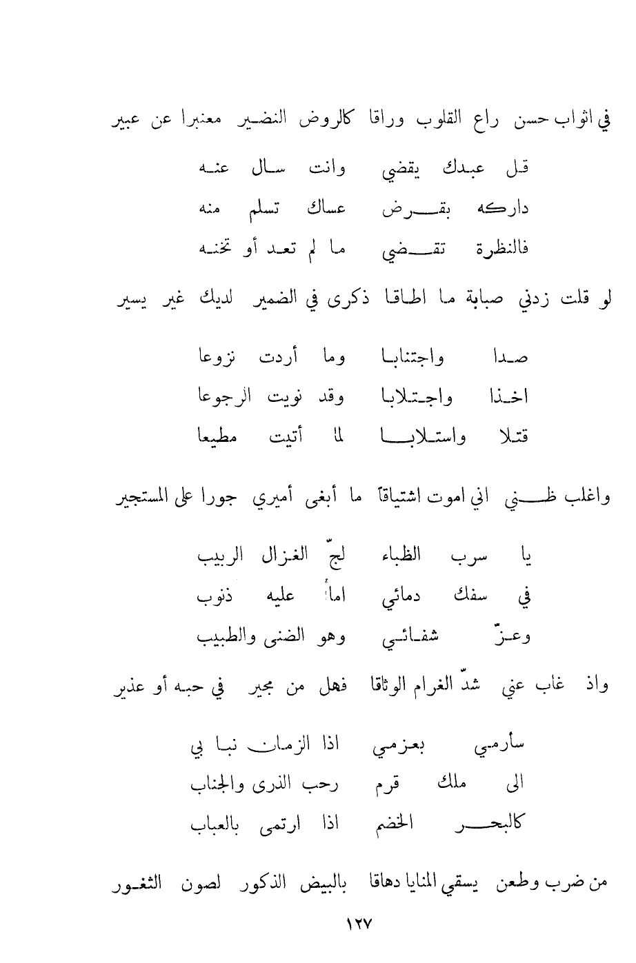 في أثواب حسن راع القلوب ... وراقا كالروض النضير معنبرا عن عبير