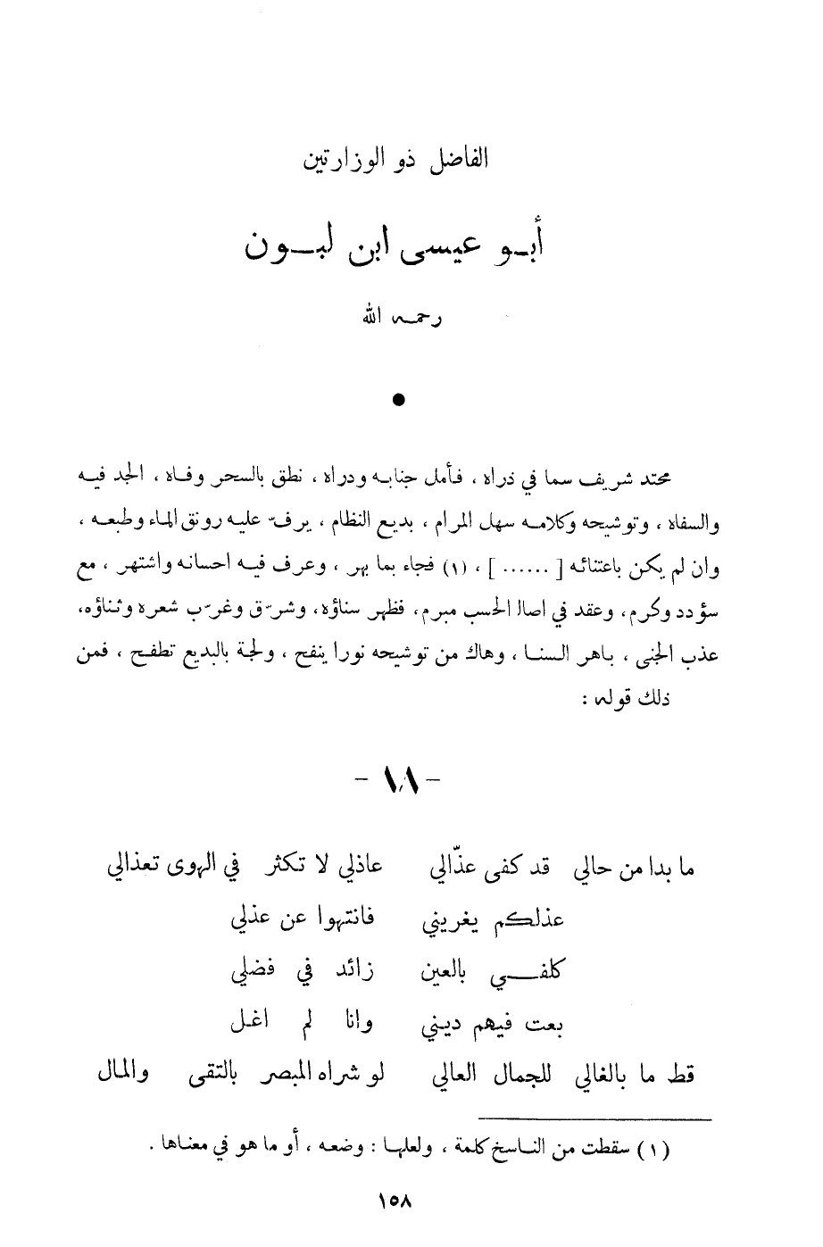 محتد شريف سما في ذراه، فأمل جنابه ودراه، نطق بالسحر وفاه، الجد فيه والسفاه، وتشيحه وكلامه سهل المرام، بديع النظام، يرف عليه رونق الماء وطبعه، وأن لم يكن باعتنائه. . .، فجاء بما بهر، وعرف فيه إحسانه واشتهر، مع عذب الجنى، باهر السنا، وهاك من توشيحه نورا ينفخ، ولجة بالبديع تطفح، منه ذلك قوله: