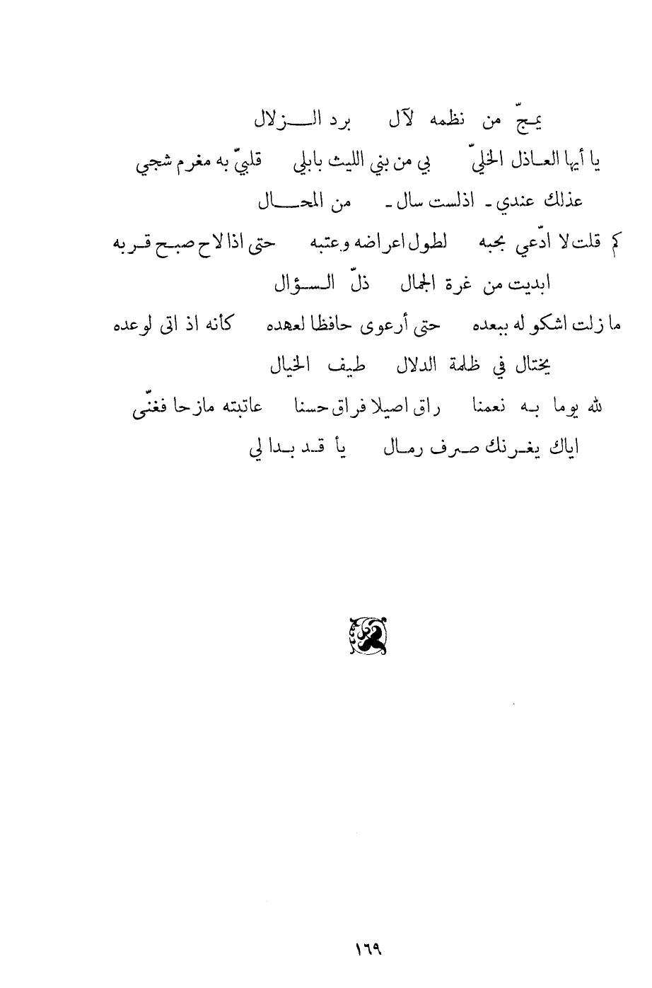 يا أيها العاذل الخليّ ... بي من بني الليثي بابلي قلبيّ به مغرم شجي