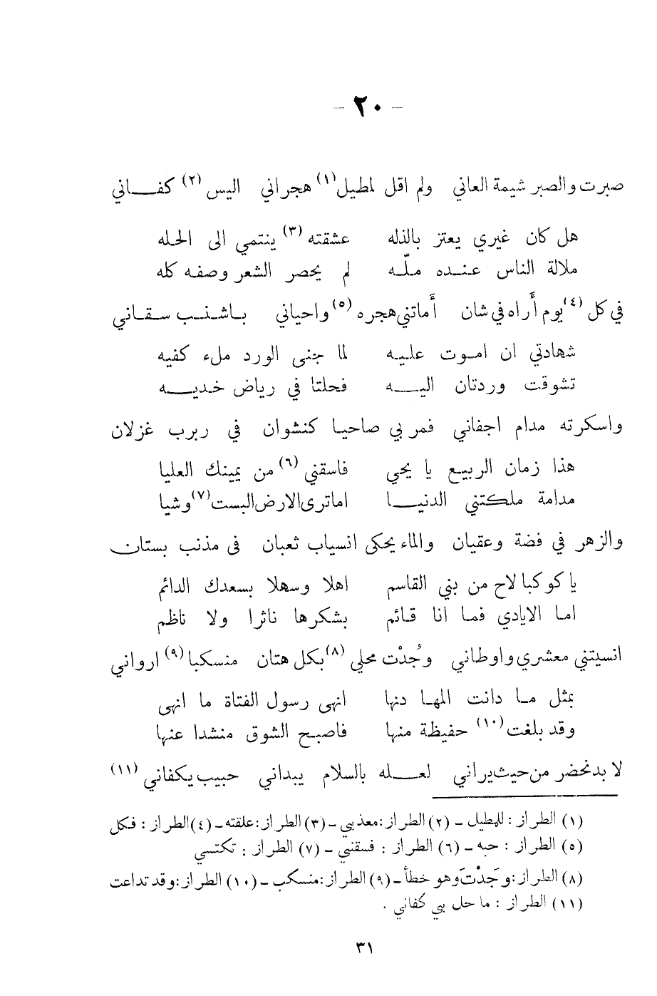 صبرت والصبر شيمة العاني ... ولم أقل لمطيل هجراني أليس كفاني