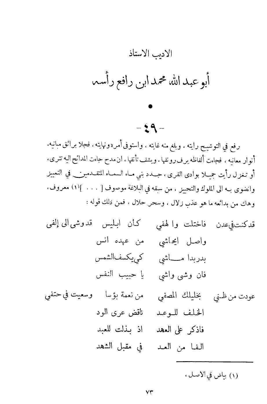 رفع في التوشيح رايته، وبلغ منه غايته، واستوفى أمره ونهايته، فجلا برائق مبانيه، أنوار معانيه، فجاءت ألفاظه يرف روتفها، ويشف تأتفها، أن مدح جاءت المدائح إليه تترى، أو تغزل رأيت جميلا بوادي القرى، جدد بني ماء السماء المتقدمين في التمييز وانضوى به إلى الملوك والتحييز، من سبقه في البلاغة موصوف. . . معروف، وهاك من بدائعه ما هو عذب زلال، وسحر حلال، فمن ذلك قوله: