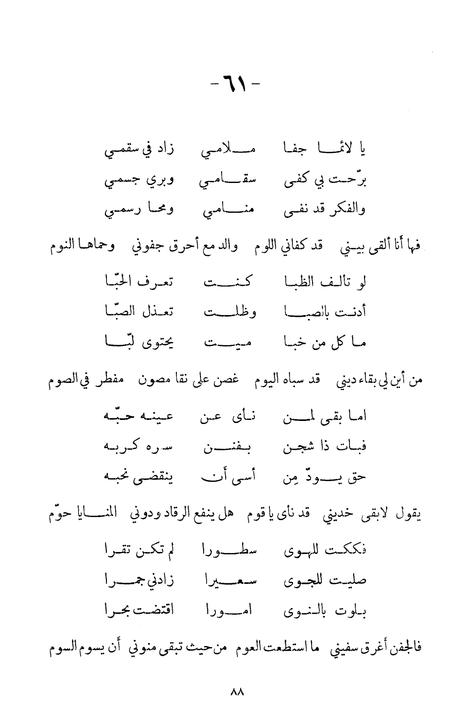 فها أنا لقى بيني قد كفاني اللوم ... والدمع أحرق جفوني وحماها النوم