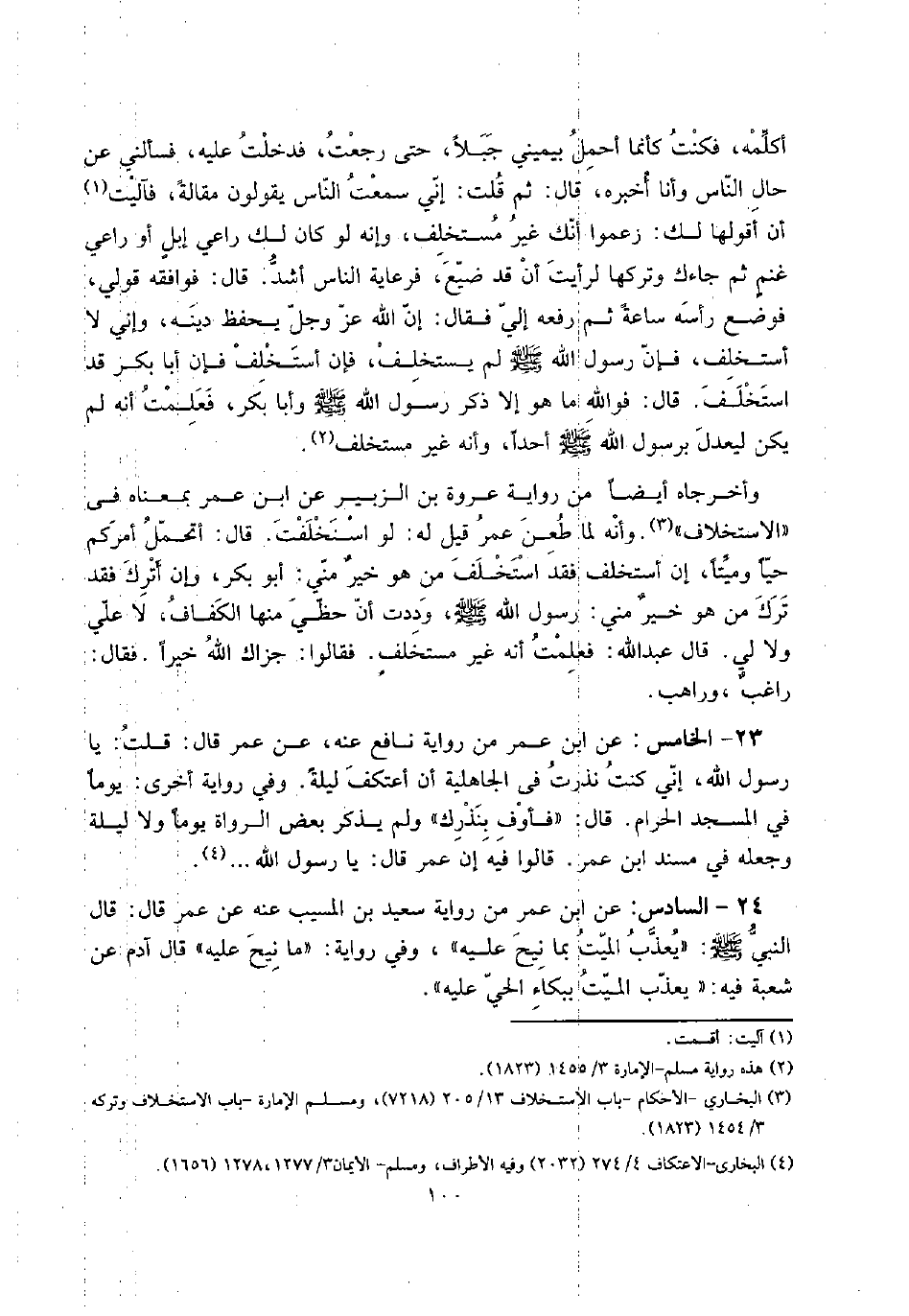 وَأَخْرَجَاهُ أَيْضا من رِوَايَة عُرْوَة بن الزبير عَن ابْن عمر بِمَعْنَاهُ فِي " الِاسْتِخْلَاف ". وَأَنه لما طعن عمر قيل لَهُ: لَو اسْتخْلفت. قَالَ: أتحمل أَمركُم حَيا وَمَيتًا، إِن أستخلف فقد اسْتخْلف من هُوَ خيرٌ مني: أَبُو بكر، وَإِن أترك فقد ترك من هُوَ خيرٌ مني: رَسُول الله صلى الله عَلَيْهِ وَسلم، وددت أَن حظي مِنْهَا الكفاف، لَا عَليّ وَلَا لي. قَالَ عبد الله: فَعلمت أَنه غير مستخلفٍ. فَقَالُوا: جَزَاك الله خيرا. فَقَالَ: راغبٌ، وراهب.