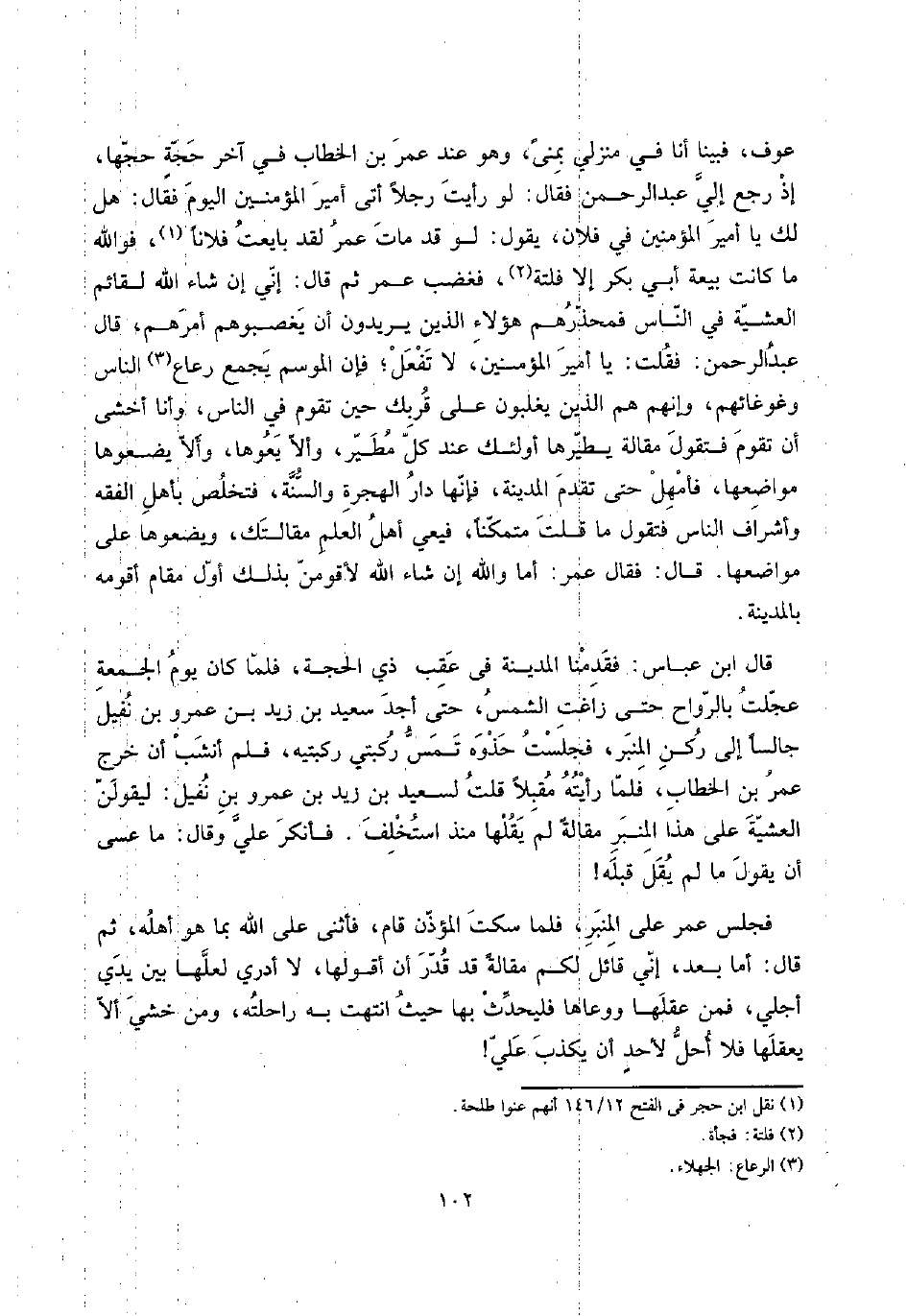 لَو رَأَيْت رجلا أَتَى أَمِير الْمُؤمنِينَ الْيَوْم فَقَالَ: هَل لَك يَا أَمِير الْمُؤمنِينَ فِي فلَان، يَقُول: لَو قد مَاتَ عمر لقد بَايَعت فلَانا، فوَاللَّه مَا كَانَت بيعَة أبي بكر إِلَّا فلتة، فَغَضب عمر ثمَّ قَالَ: إِنِّي إِن شَاءَ الله لقائم العشية فِي النَّاس فمحذرهم هَؤُلَاءِ الَّذين يُرِيدُونَ أَن يغصبوهم أَمرهم، قَالَ عبد الرَّحْمَن: فَقلت: يَا أَمِير الْمُؤمنِينَ، لَا تفعل؛ فَإِن الْمَوْسِم يجمع رعاع النَّاس وغوغائهم، وَإِنَّهُم هم الَّذين يغلبُونَ على قربك حِين تقوم فِي النَّاس، وَأَنا أخْشَى أَن تقوم فَتَقول مقَالَة يطيرها أُولَئِكَ عِنْد كل مطير، وَألا يعوها، وَألا يضعوها موَاضعهَا، فأمهل حَتَّى تقدم الْمَدِينَة، فَإِنَّهَا دَار الْهِجْرَة وَالسّنة، فتخلص بِأَهْل الْفِقْه وأشراف النَّاس فَتَقول مَا قلت مُتَمَكنًا، فيعي أهل الْعلم مَقَالَتك، ويضعوها على موَاضعهَا. قَالَ: فَقَالَ عمر: أما وَالله إِن شَاءَ الله لأقومن بذلك أول مقَام أقومه بِالْمَدِينَةِ.