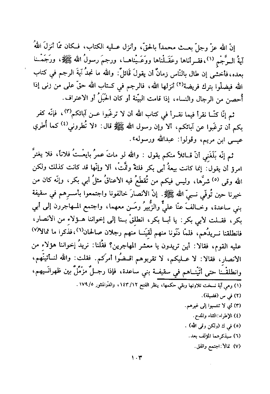 إِن الله عز وَجل بعث مُحَمَّدًا بِالْحَقِّ، وَأنزل عَلَيْهِ الْكتاب، فَكَانَ مِمَّا أنزل الله آيَة الرَّجْم، فقرأناها وعقلناها ووعيناها، ورجم رَسُول الله صلى الله عَلَيْهِ وَسلم، ورجمنا بعده، فأخشى إِن طَال بِالنَّاسِ زمانٌ أَن يَقُول قائلٌ: وَالله مَا نجد آيَة الرَّجْم فِي كتاب الله فيضلوا بترك فَرِيضَة أنزلهَا الله، فَالرَّجْم فِي كتاب الله حق على من زنى إِذا أحصن من الرِّجَال وَالنِّسَاء، إِذا قَامَت الْبَيِّنَة أَو كَانَ الْحَبل أَو الِاعْتِرَاف.