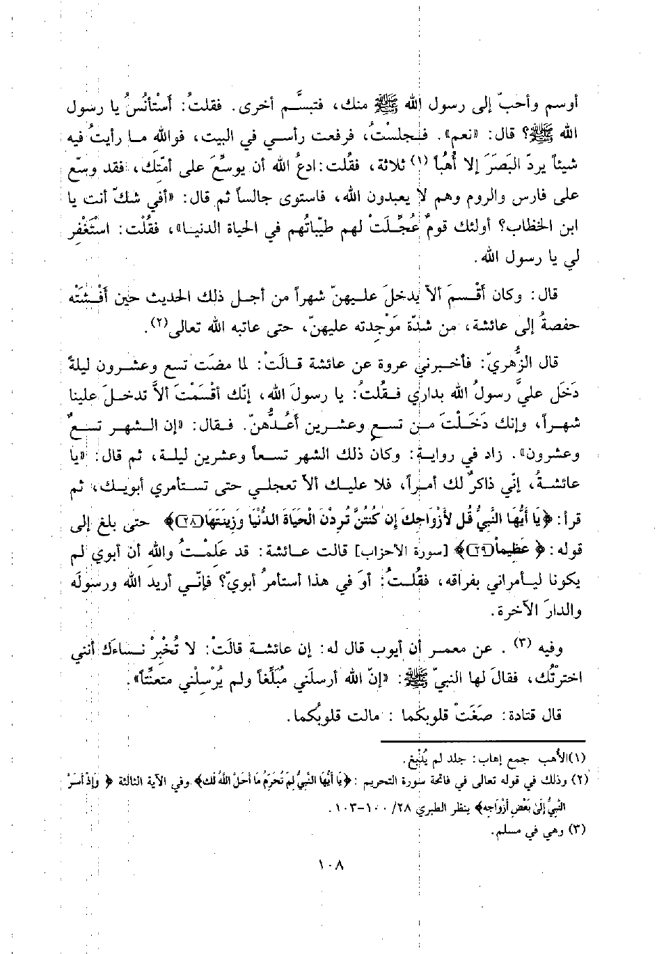 أوسم وَأحب إِلَى رَسُول الله صلى الله عَلَيْهِ وَسلم مِنْك، فَتَبَسَّمَ أُخْرَى. فَقلت: أستأنس يَا رَسُول الله صلى الله عَلَيْهِ وَسلم؟ قَالَ: " نعم ". فَجَلَست، فَرفعت رَأْسِي فِي الْبَيْت، فوَاللَّه مَا رَأَيْت فِيهِ شَيْئا يرد الْبَصَر إِلَّا أهباً ثَلَاثَة، فَقلت: ادْع الله أَن يُوسع على أمتك، فقد وسع على فَارس وَالروم وهم لَا يعْبدُونَ الله، فَاسْتَوَى جَالِسا ثمَّ قَالَ: " أَفِي شكّ أَنْت يَا ابْن الْخطاب؟ أُولَئِكَ قومٌ عجلت لَهُم طَيِّبَاتهمْ هم فِي الْحَيَاة الدُّنْيَا "، فَقلت: اسْتغْفر لي يَا رَسُول الله.