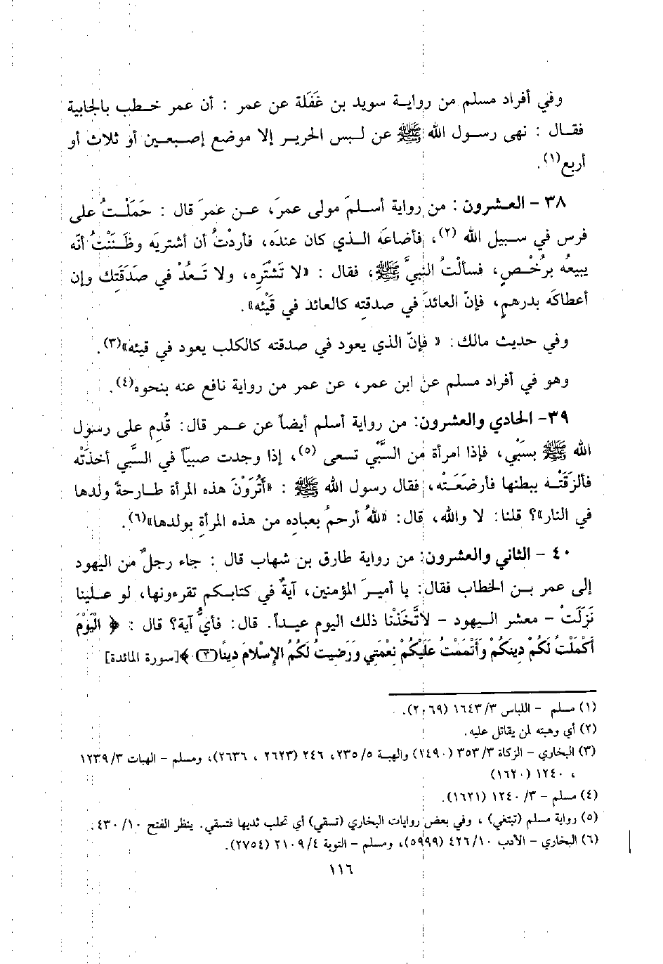 40 - الثَّانِي وَالْعشْرُونَ: من رِوَايَة طَارق بن شهَاب قَالَ: جَاءَ رجلٌ من الْيَهُود إِلَى عمر بن الْخطاب فَقَالَ: يَا أَمِير الْمُؤمنِينَ، آيةٌ فِي كتابكُمْ تقرءونها، لَو علينا نزلت - معشر الْيَهُود - لاتخذنا ذَلِك الْيَوْم عيداً. قَالَ: فَأَي آيَة؟ قَالَ: {الْيَوْم أكملت لكم دينكُمْ وَأَتْمَمْت عَلَيْكُم نعمتي ورضيت لكم الْإِسْلَام دينا} [سُورَة الْمَائِدَة]