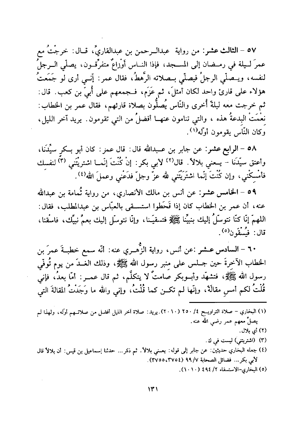 57 - الثَّالِث عشر: من رِوَايَة عبد الرَّحْمَن بن عبد الْقَارِي، قَالَ: خرجت مَعَ عمر لَيْلَة فِي رَمَضَان إِلَى الْمَسْجِد، فَإِذا النَّاس أوزاعٌ متفرقون، يُصَلِّي الرجل لنَفسِهِ، وَيُصلي الرجل فَيصَلي بِصَلَاتِهِ الرَّهْط، فَقَالَ عمر: إِنِّي أرى لَو جمعت هَؤُلَاءِ على قَارِئ وَاحِد لَكَانَ أمثل، ثمَّ عزم، فَجَمعهُمْ على أبي بن كَعْب. قَالَ: ثمَّ خرجت مَعَه لَيْلَة أُخْرَى وَالنَّاس يصلونَ بِصَلَاة قارئهم، فَقَالَ عمر بن الْخطاب: نعمت الْبِدْعَة هَذِه، وَالَّتِي تنامون عَنْهَا أفضل من الَّتِي تقومون. يُرِيد آخر اللَّيْل، وَكَانَ النَّاس يقومُونَ أَوله.