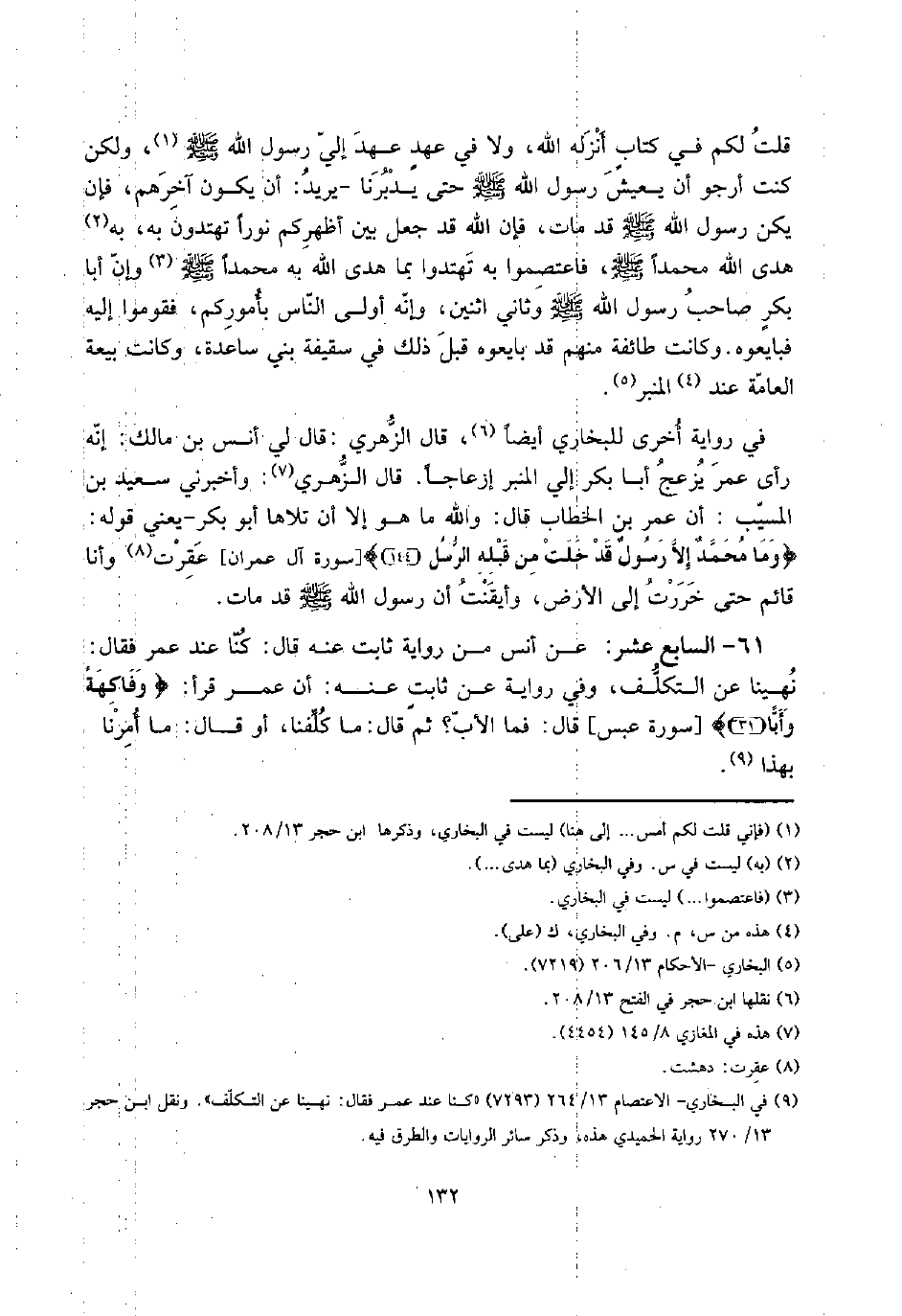 رأى عمر يزعج أَبَا بكر إِلَيّ الْمِنْبَر إزعاجاً. قَالَ الزُّهْرِيّ: وَأَخْبرنِي سعيد بن الْمسيب: أَن عمر بن الْخطاب قَالَ: وَالله مَا هُوَ إِلَّا أَن تَلَاهَا أَبُو بكر - يَعْنِي قَوْله: {وَمَا مُحَمَّد إِلَّا رَسُول قد خلت من قبله الرُّسُل} [سُورَة آل عمرَان] عقرت وَأَنا قَائِم حَتَّى خَرَرْت إِلَى الأَرْض، وأيقنت أَن رَسُول الله صلى الله عَلَيْهِ وَسلم قد مَاتَ.